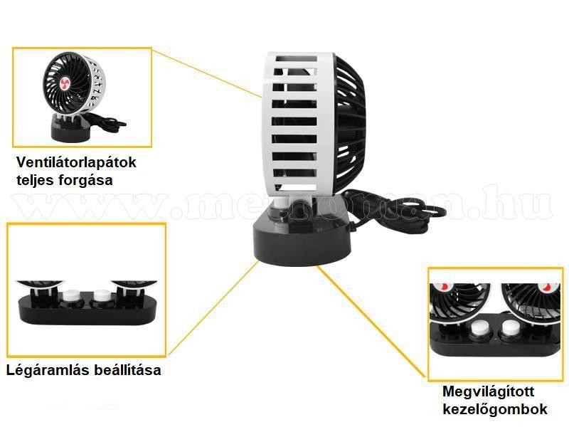 Praktikus, egyszerűen telepíthető nagy hatásfokú dupla autós ventilátor. A csomagban található öntapadós ragasztóval egyszerűen rögzíthető és a 12V szivargyújtóba csatlakoztatva azonnal használható.