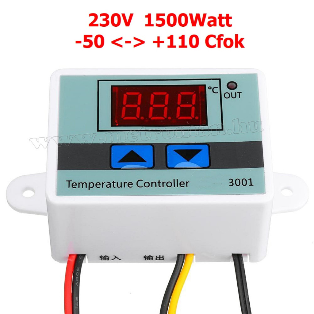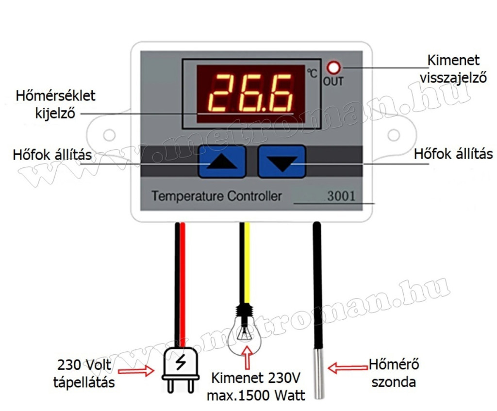 230 Voltos hőfokszabályzó, mellyel 230V max. 1500 Watt teljesítményű eszközöket vezérelhetünk a beállított hőmérséklet szerint. A kapcsolási és visszakapcsolási hőmérséklet külön-külön állítható, így speciális szabályzásokhoz is használható. Alkalmas hűtő és fűtő rendszerek vezérlésére is.