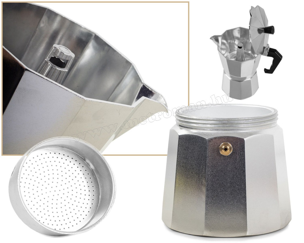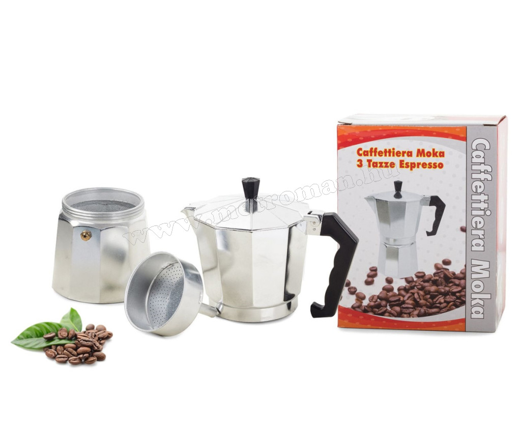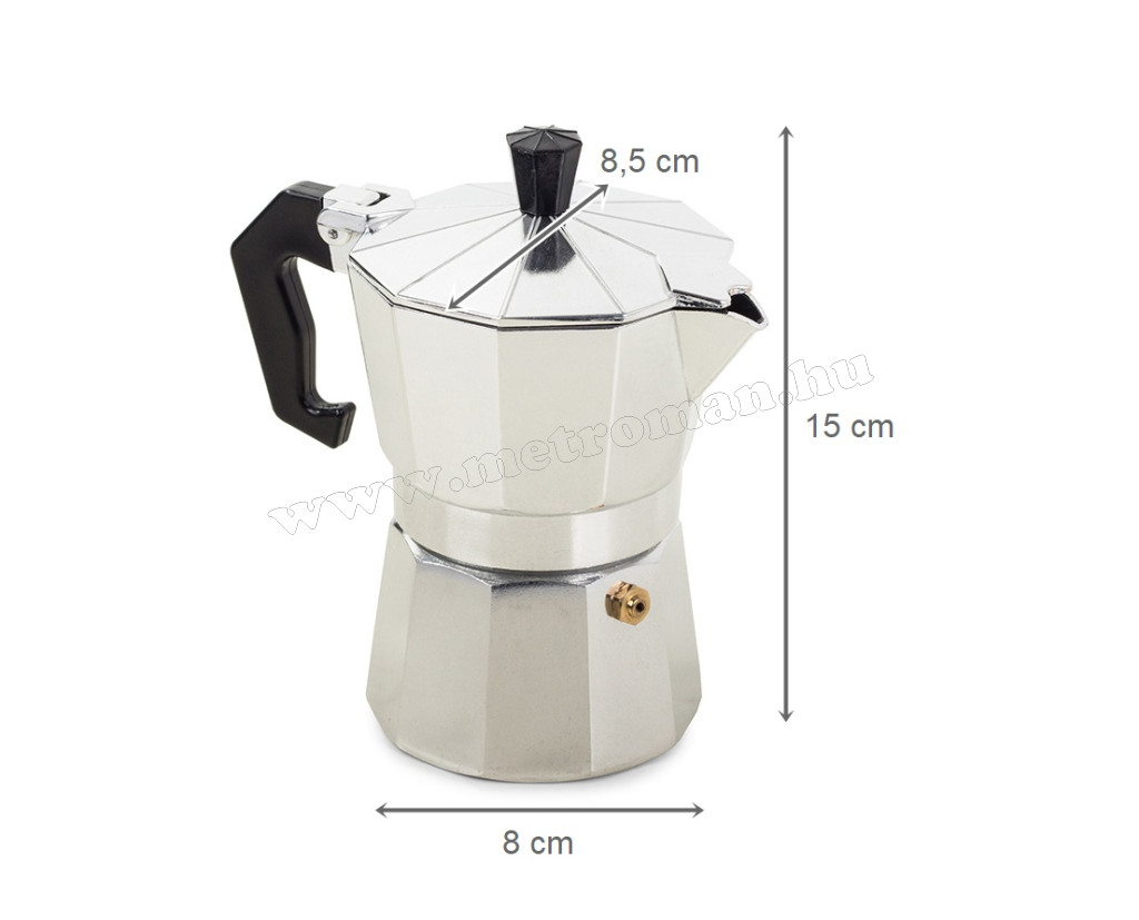 Ébredjen minden reggel az igazi olasz kávéházak hangulatára 3 csészés kotyogós kávéfőzőnk segítségével! Ez a minőségi alumínium kávéfőző a kotyogó kávéfőzők klasszikus dizájnját hozza, így biztosítva a tökéletes eszpresszó élményt otthonában. Gyors és egyszerű használat, ideális otthonra vagy irodába. Élvezze a friss, aromás kávét pillanatok alatt!