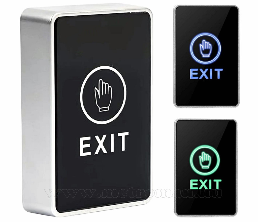 Igényes kivitelő falon kívülre szerelhető érintőgombos kiléptető kapcsoló elektromos zárakhoz és beléptető rendszerekhez.
