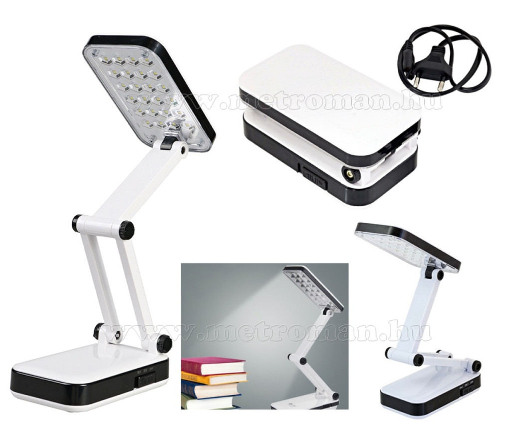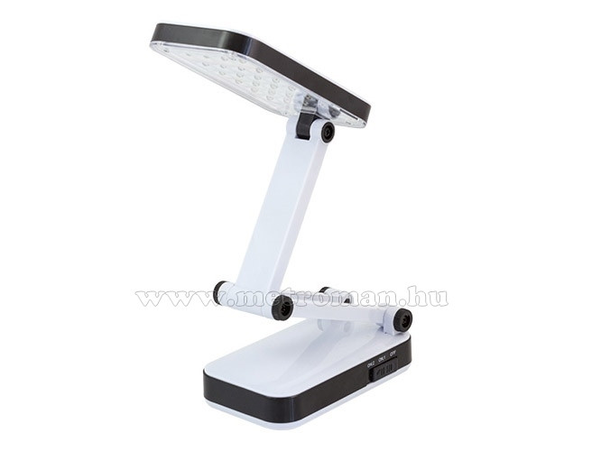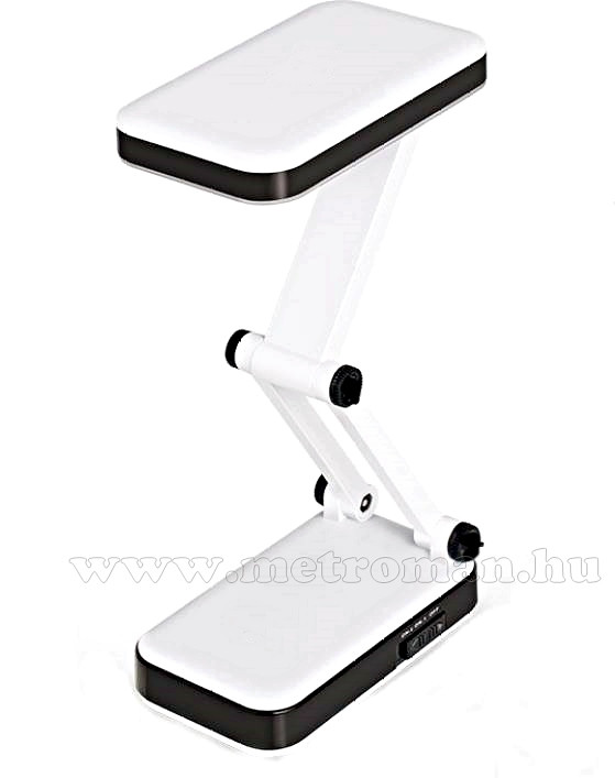 Összecsukható, beépített akkus asztali LED lámpa. 230 Voltos hálózatról tölthető és 2 külön kacsolható fényerővel rendelkezik.
