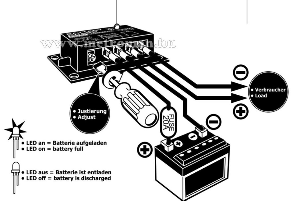 Az akkuőrző védi az autó-akkumulátort mélykisüléstől, úgy, hogy idejében kikapcsolja (kb.12 V ą0,2 V-on) a fogyasztót, pl. hűtőládát, fűtést, rádiót, tévékészüléket, stb. A normál feszültség helyreállásakor ismét bekapcsol. Beállítható lekapcsolási feszültség: kb. 10,4 - 13,3 V, max. 20 A.