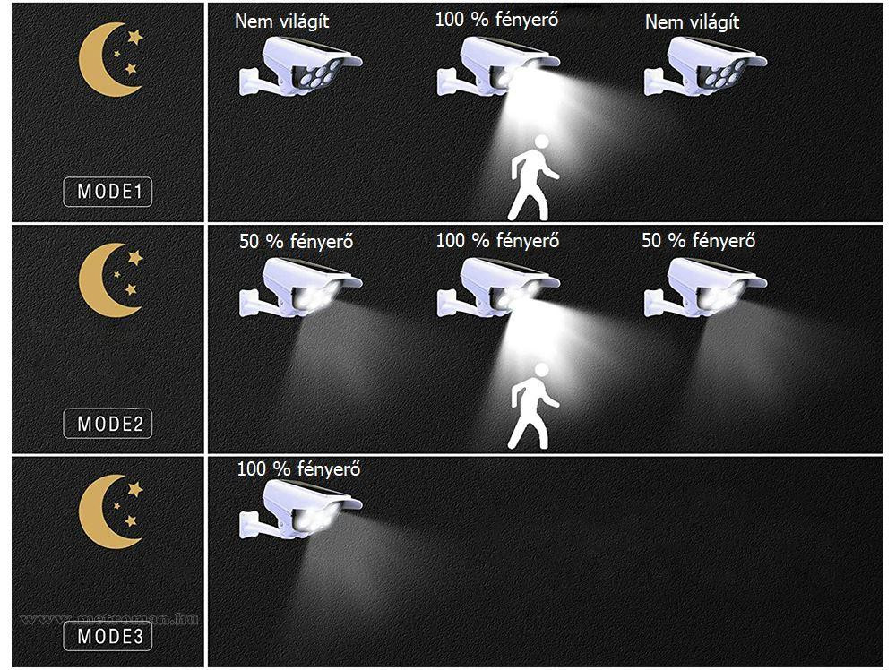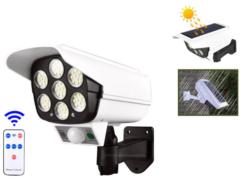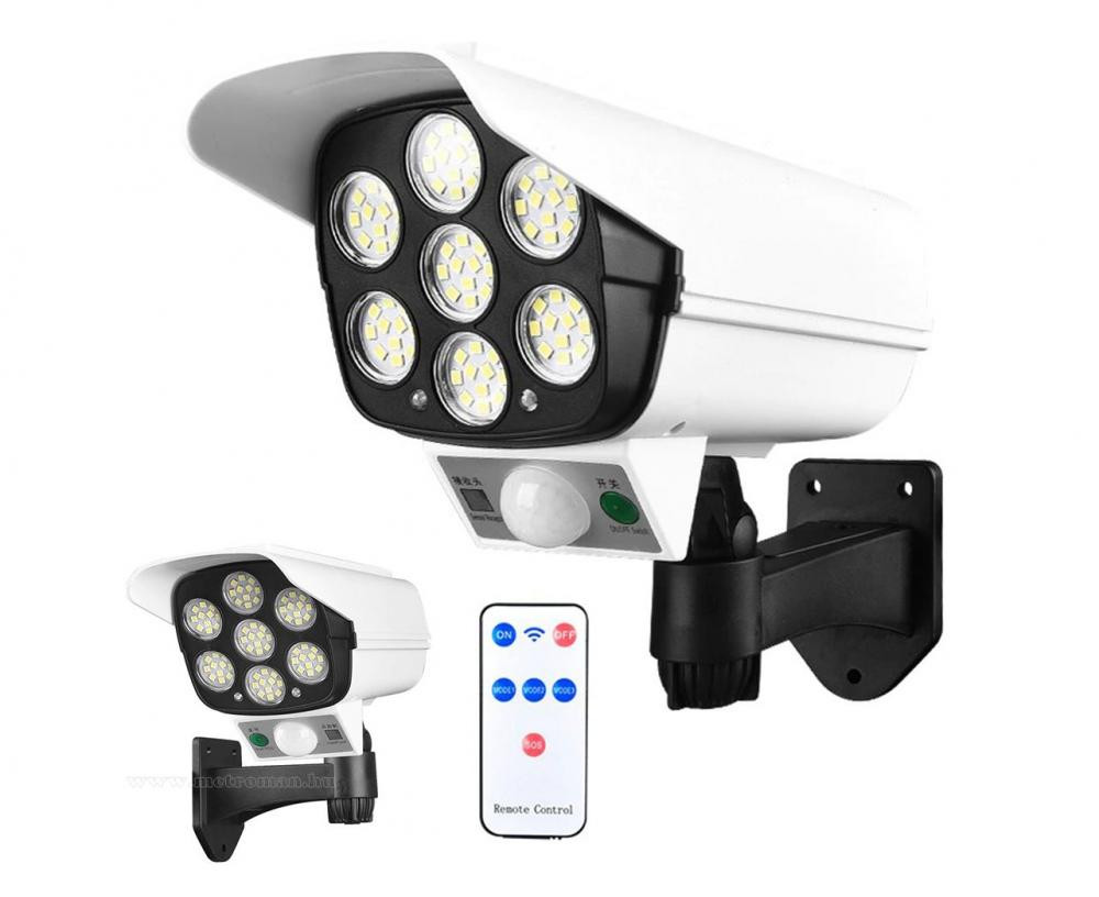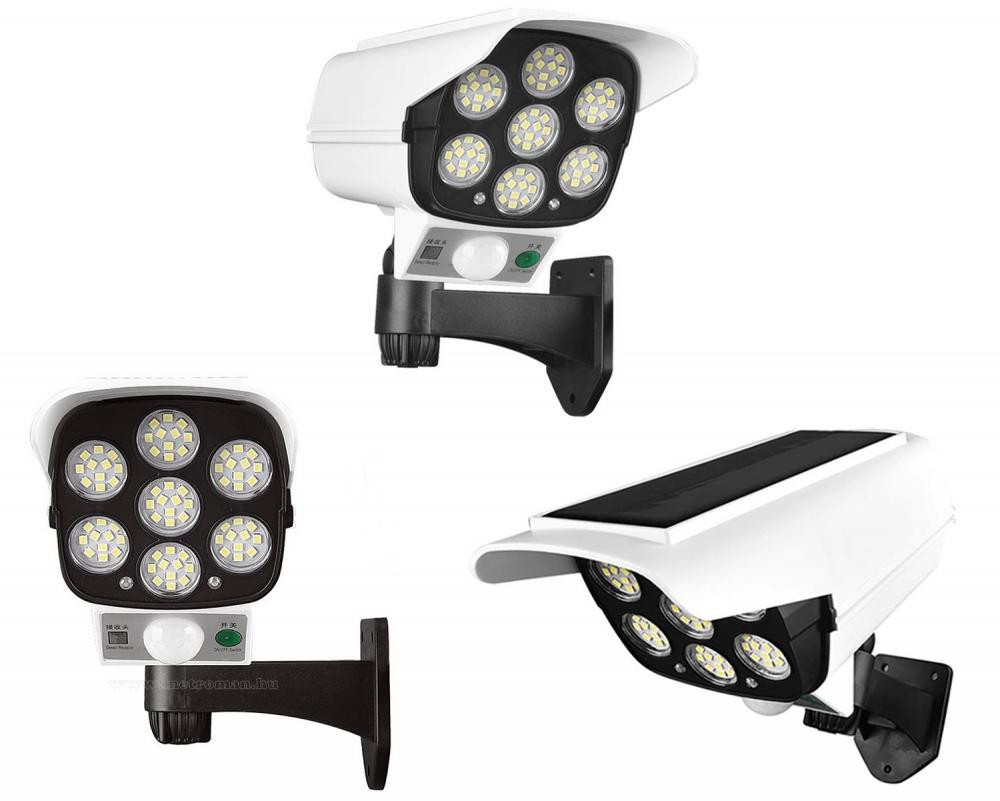 Álkamera, mely solar LED lámpa is egyben. A villogó piros LED-nek köszöhetően a biztonsági kamerák tökéletes illúzióját kelti.