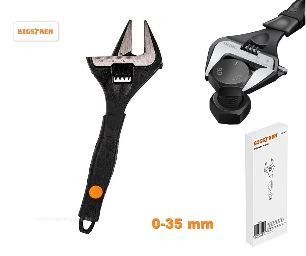 Tartós szénacélból készült állítható villáskulcs mely alkalmas professzionális műhelyi környezetben és mindennapi otthoni javításokra egyaránt. Az állítható csavarkulcs 0-35 mm között kihúzható pofákkal és ezek pontos beállításához csavarható gombbal rendelkezik.