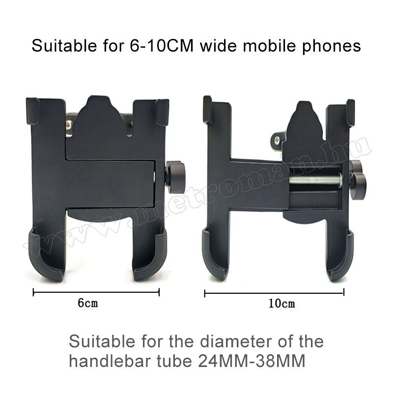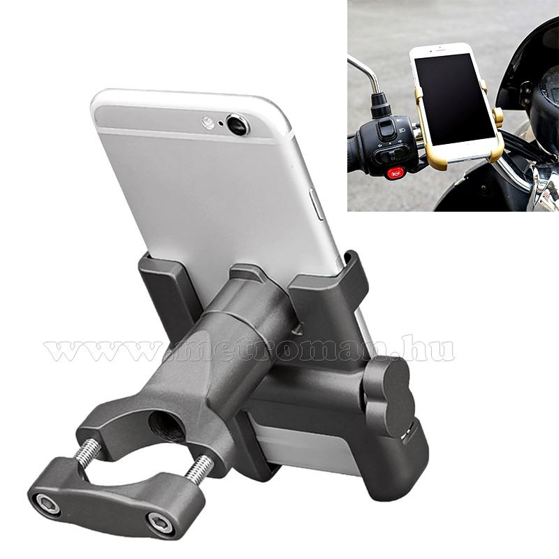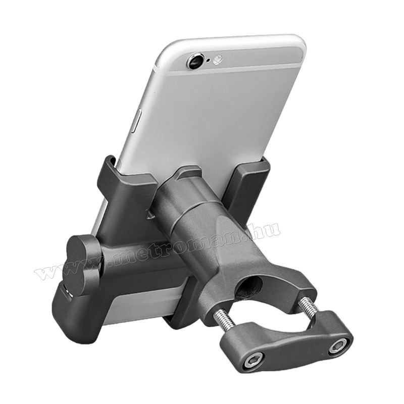 Masszív alumínium motorkerékpár telefontartó  kormányra. A szintén fém szorítóval a telefon stabilan rögzíthető.