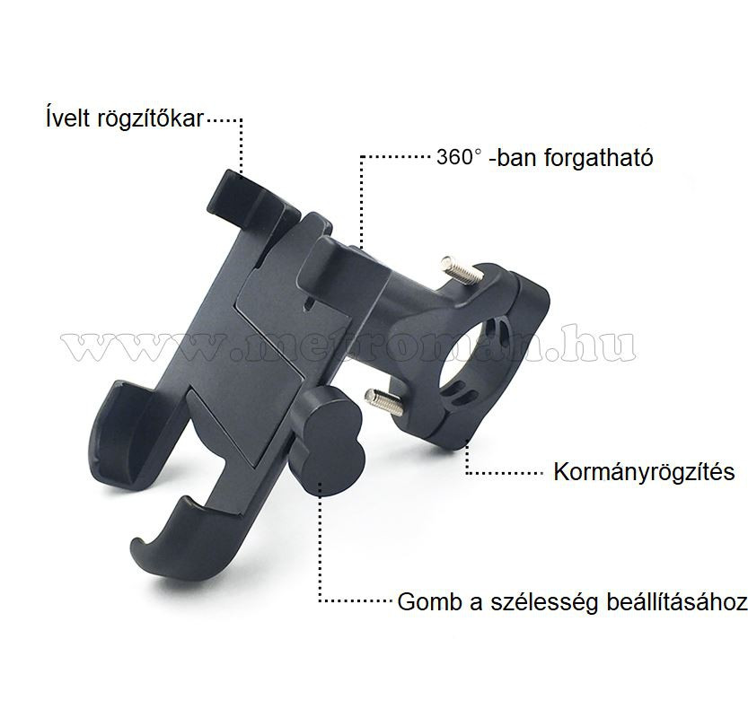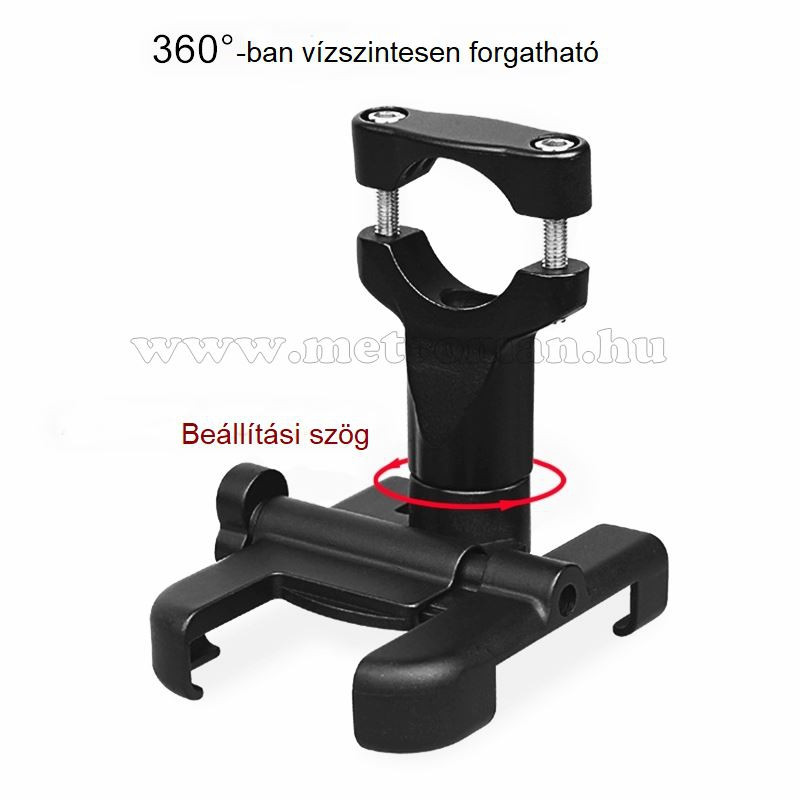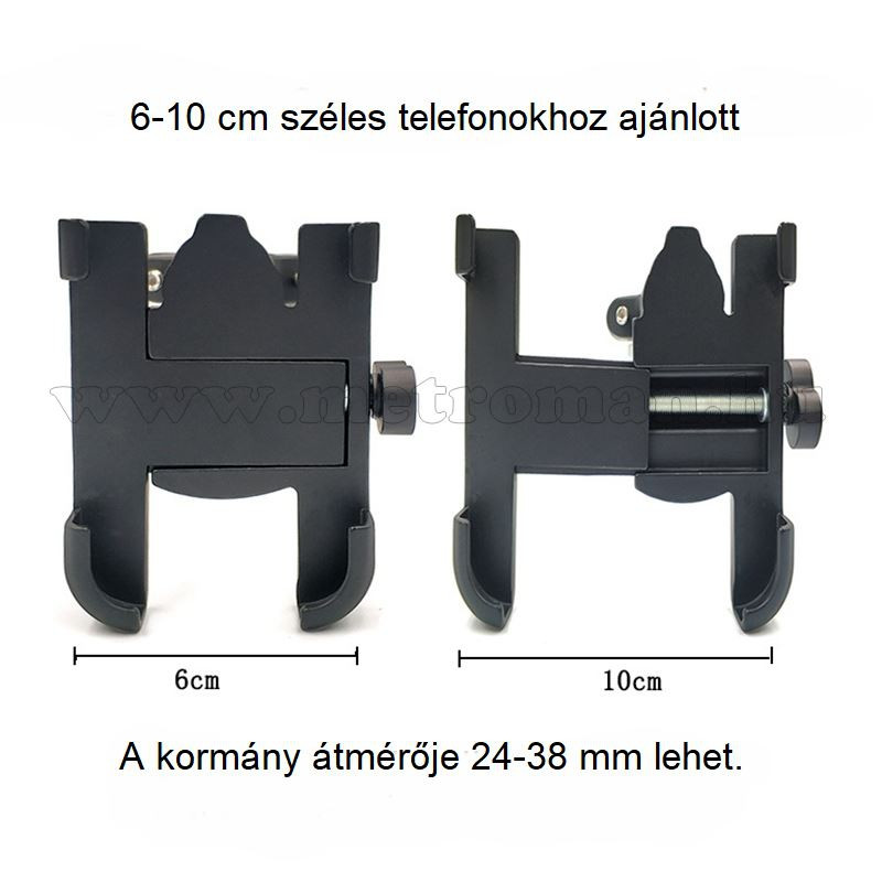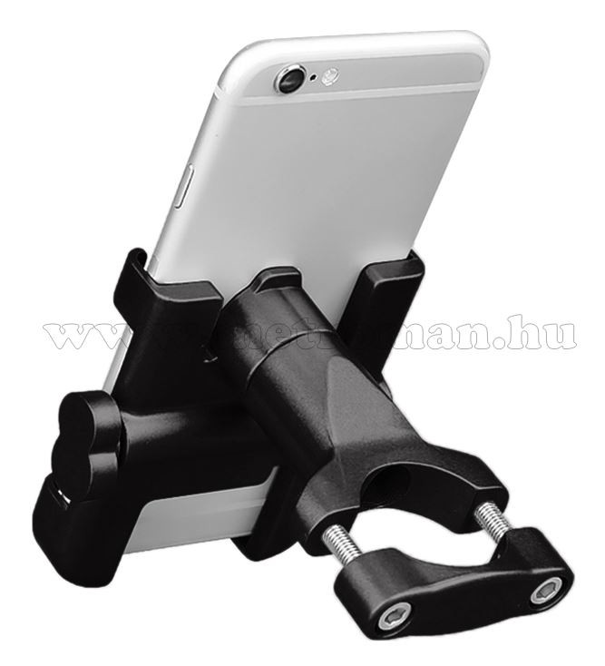 Masszív alumínium motorkerékpár telefontartó  kormányra. A szintén fém szorítóval a telefon stabilan rögzíthető.