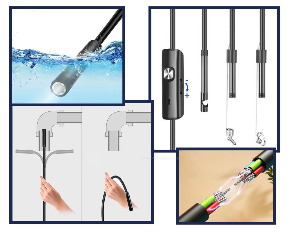Új, innovatív, teljesen vízálló endoszkóp kamera 8 LED-del, állítható fényerősséggel. Nagyon rugalmas és strapabíró kábellel, mágneses heggyel, kampóval és tükörrel rendelkezik.