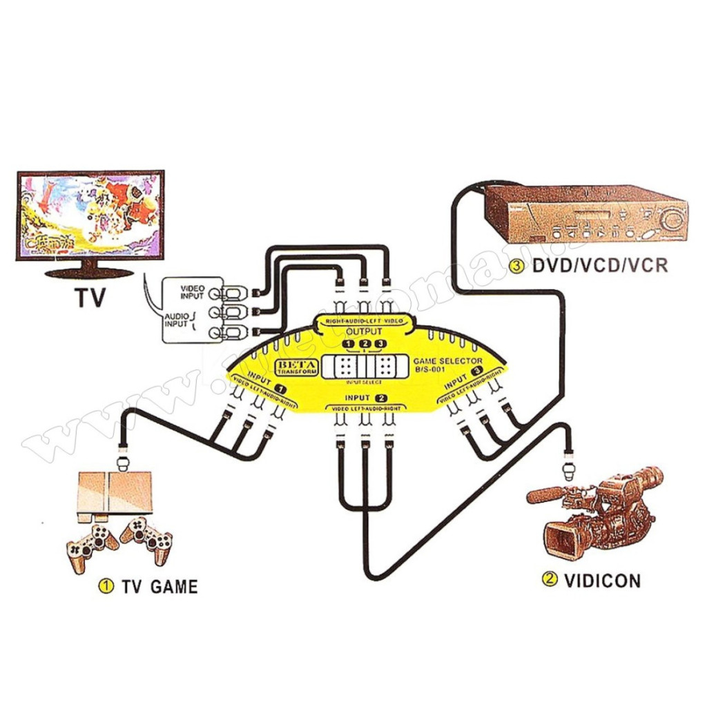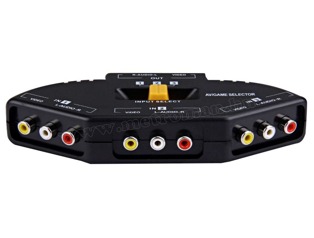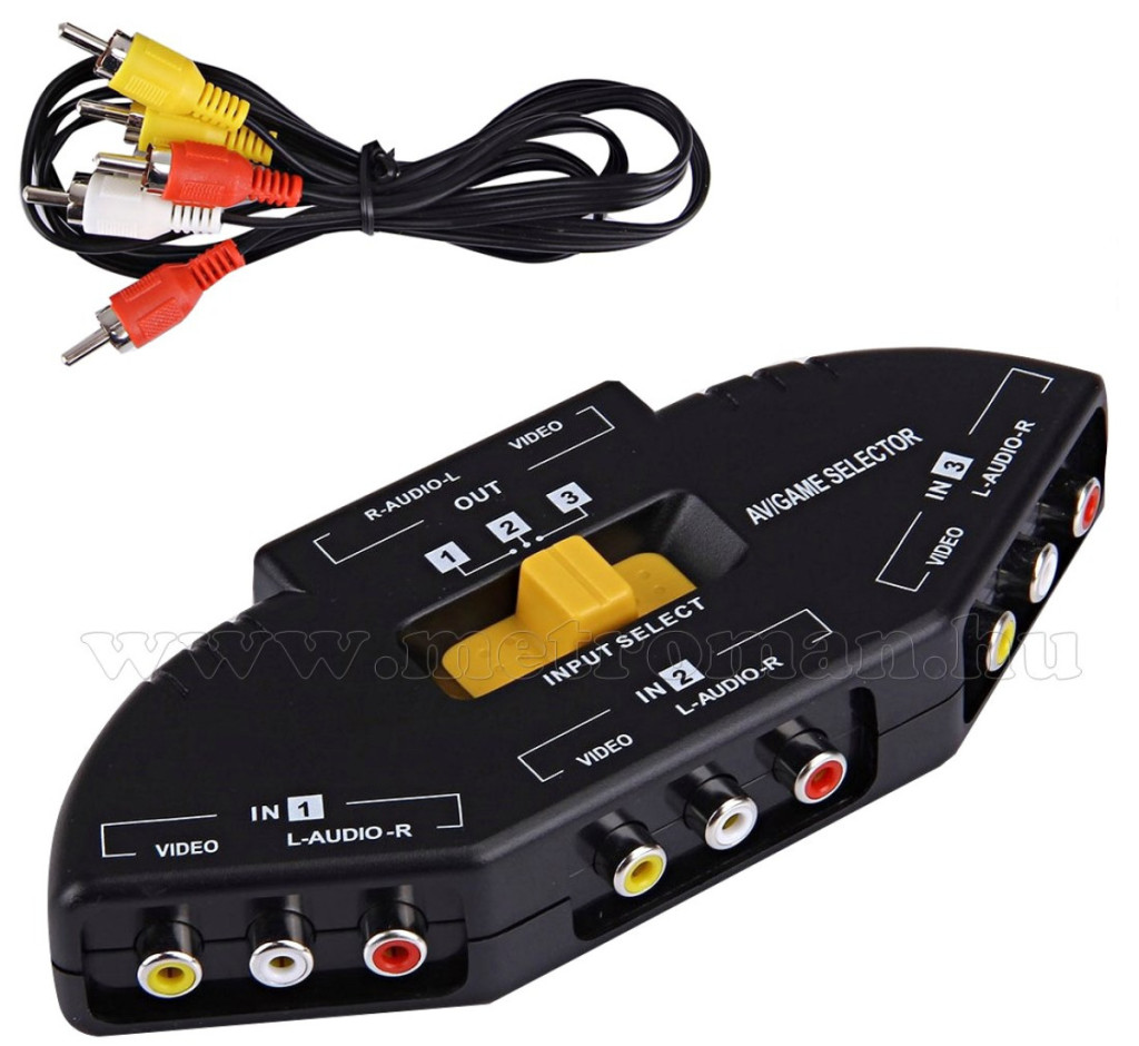 Ezzel az RCA elosztóval egyetlen bemenetre csatlakoztathatunk 3 db RCA audió vagy Videó eszközt. A használni kívánt készülék az kapcsolópulton található kapcsolóval kiválasztható.