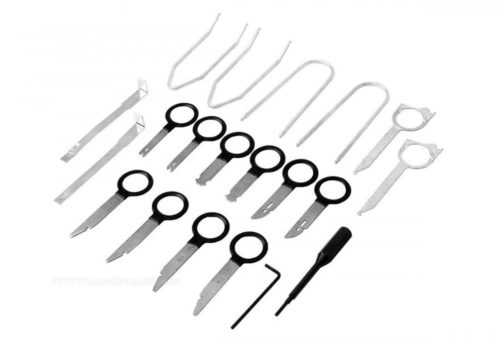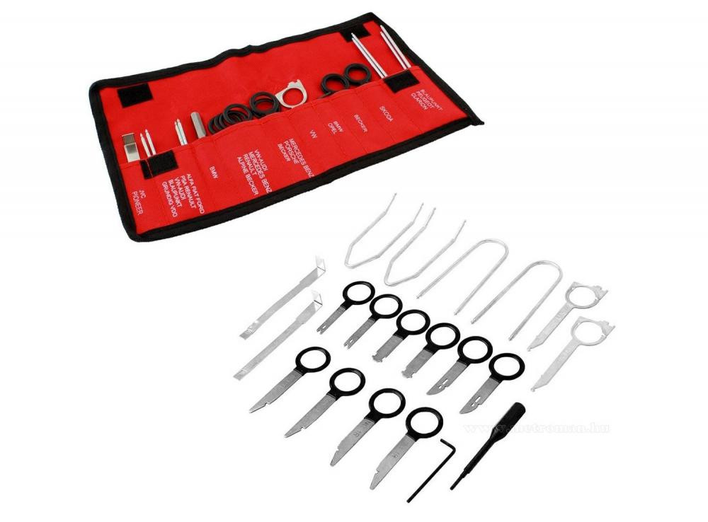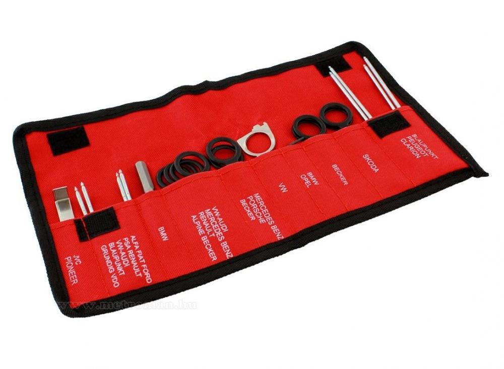 20 db-os autórádió kiszerelő szereszám készlet, mely  alkalmas: Blaupunkt, Clarion, Becker, Grundig VDO, Alpine, JVC, Pioneer készülékekhez, Peugeot, Skoda, BMW, Opel, VW, Mercedes Benz, Audi Renault, Alfa, Porsche, Fiat, Ford autókhoz.