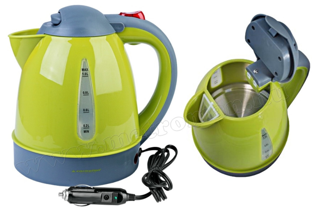 12 V autós szivargyújtó csatlakozóról használható vízforraló, mely kitűnően használható autóban, hajóban vagy lakókocsiban.