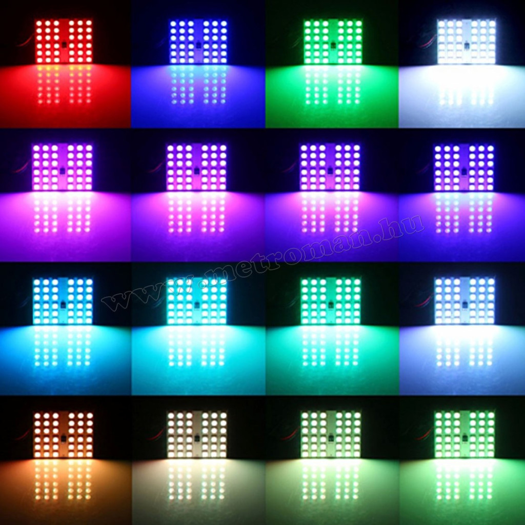 Kitűnő autós dekoráció és hangulatvilágítás. 15 RGB SMD LED-es LED panel Szofita és T10 adapterrel, mely a tartozék távirányítóval szinte bármilyen színre kapcsolható.