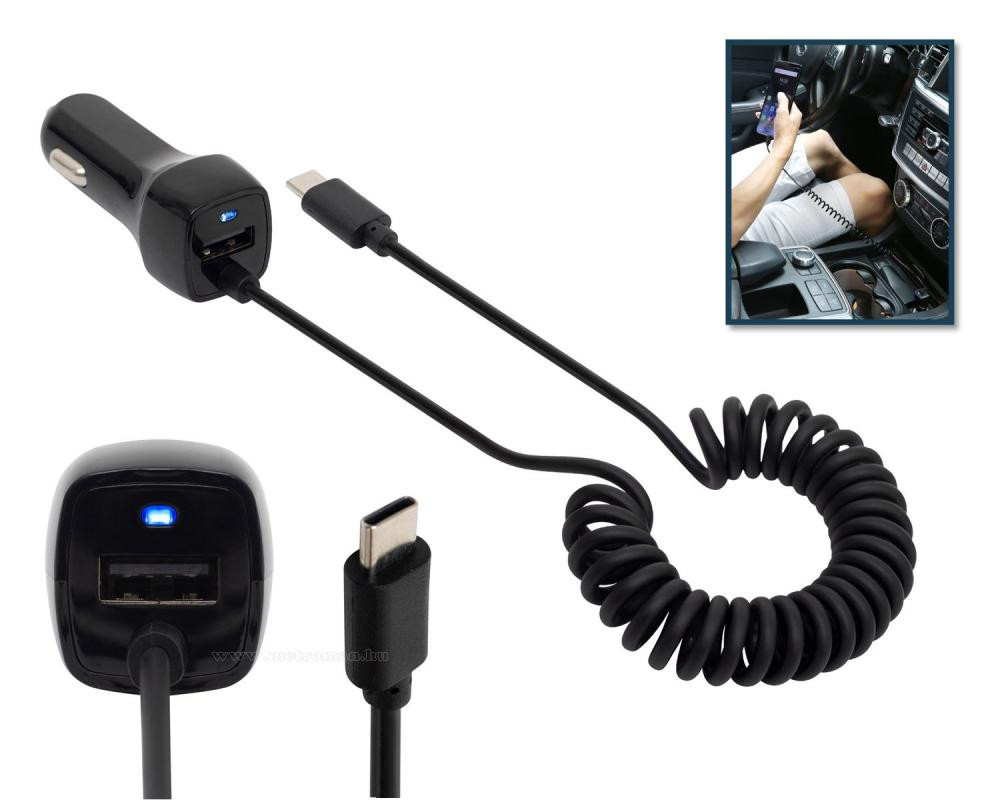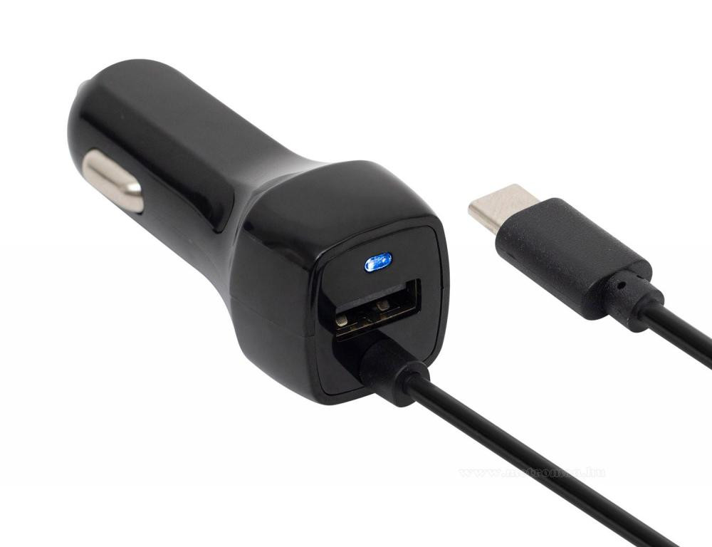 Autós töltő, mely 12-24 V-os szivargyújtó aljzatról működik. Egy USB-C csatlakozóval és egy USB porttal rendelkezik. Alkalmas két készülék egyidejű töltésére, pl. okostelefonok, táblagépek, GPS navigációk.