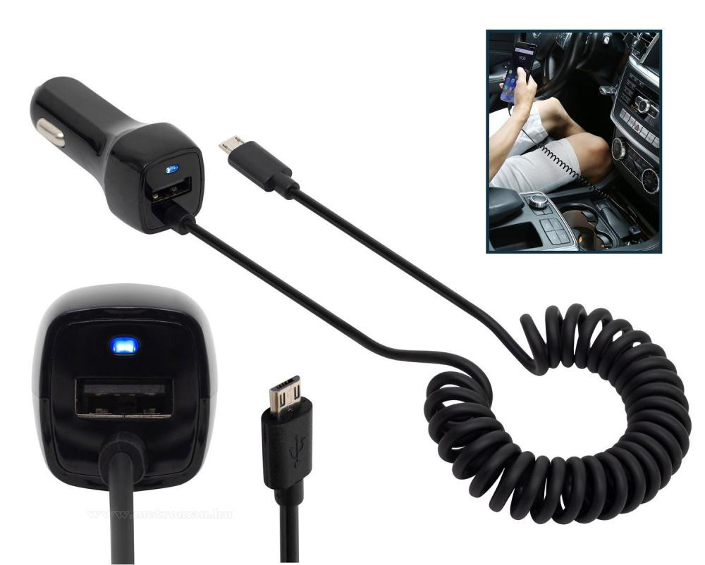 Autós töltő, mely 12-24 V-os szivargyújtó aljzatról működik. Egy microUSB csatlakozóval és egy USB porttal rendelkezik. Alkalmas két készülék egyidejű töltésére, pl. mobiltelefonok, okostelefonok, táblagépek, MP3 / MP4 lejátszók vagy GPS navigációk.