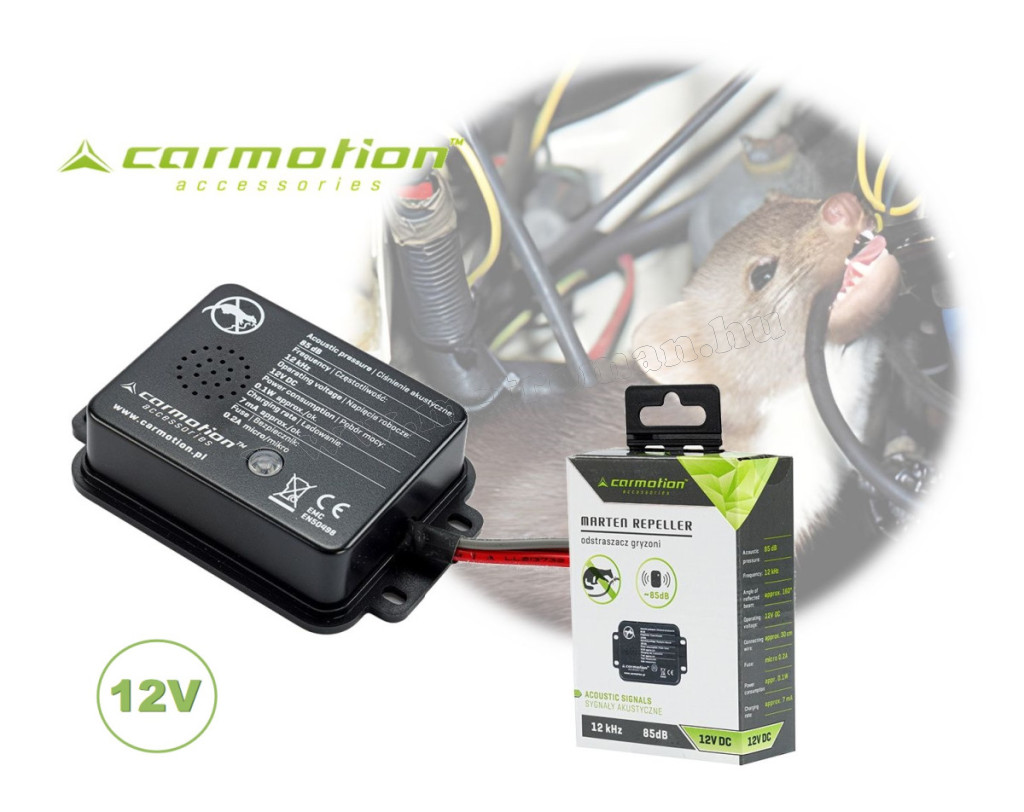 Nyest és patkányriasztó, mely autó akkumulátorához csatlakoztatható. A nyest- és patkányriasztó 15 másodpercenként 12 kHz-es hangot ad ki.