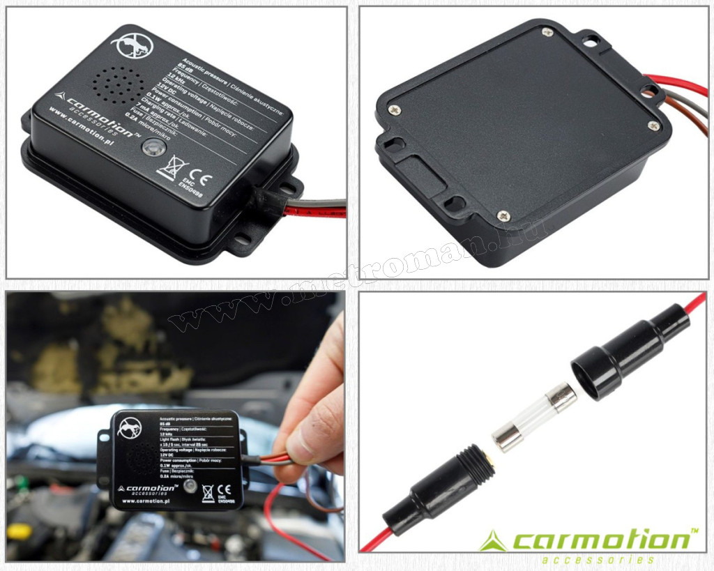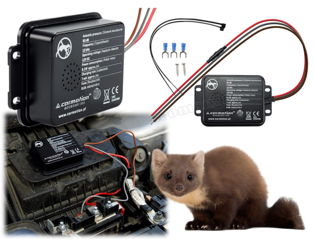 A nagyon magas gyakoriság miatt a rágcsálók, például nyest, patkány és más rágcsálók távol maradnak a járműtől. Ezt a rágcsálóriasztót egyszerűen csatlakoztathatja autója akkumulátorához. A kisállatriasztó megfelelő felszereléséhez először csavarokkal vagy kétoldalas ragasztószalaggal kell rögzítenie az autó motorházteteje alá. A készülék közvetlenül az autó akkumulátorához csatlakozik, amelyet meg akarunk védeni a hívatlan vendégek ellen.