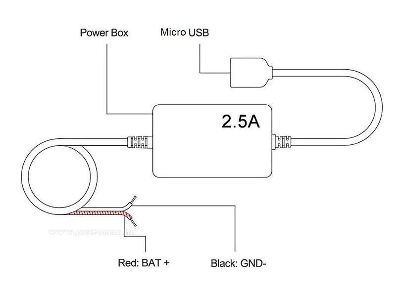 Bekötés: fekete vezeték negatív, piros vezeték pozitív