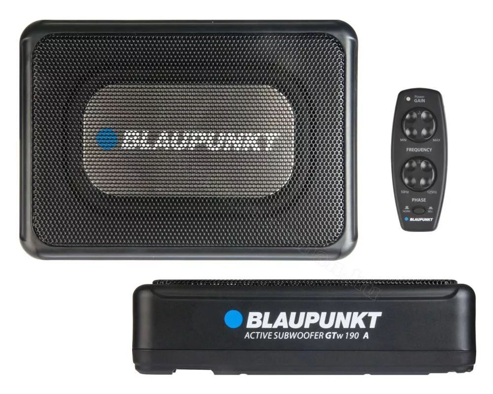 Blaupunkt GTW 190 A aktív lapos mélysugárzó. Kompakt méretének köszönhetően ülés alá is építhető. 5" x 8" membrán, 80W folyamatos, 150W maximális teljesítmény. Vezetékes távirányítója is van, így könnyedén szabályozható az erősítés, a fázis és az LPF is.
