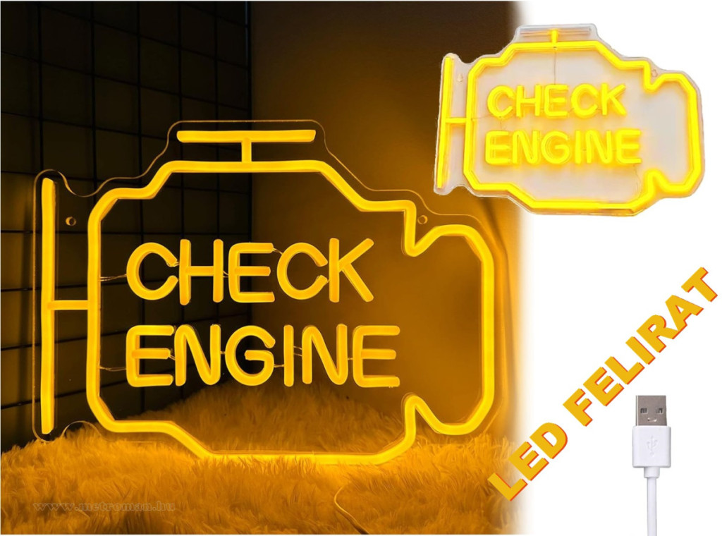 Motor alakú dekoratív LED lámpa CHECK ENGINE  felirattal. A szilikon fénycsík tökéletesen utánozza a neoncső megjelenését. A hagyományos neonfelirat energiatakarékos alternatívája. A LED világító tábla nagyszerű hangulatvilágítás garázs vagy műhely falára, házibulikra, ünnepi alkalmakra.