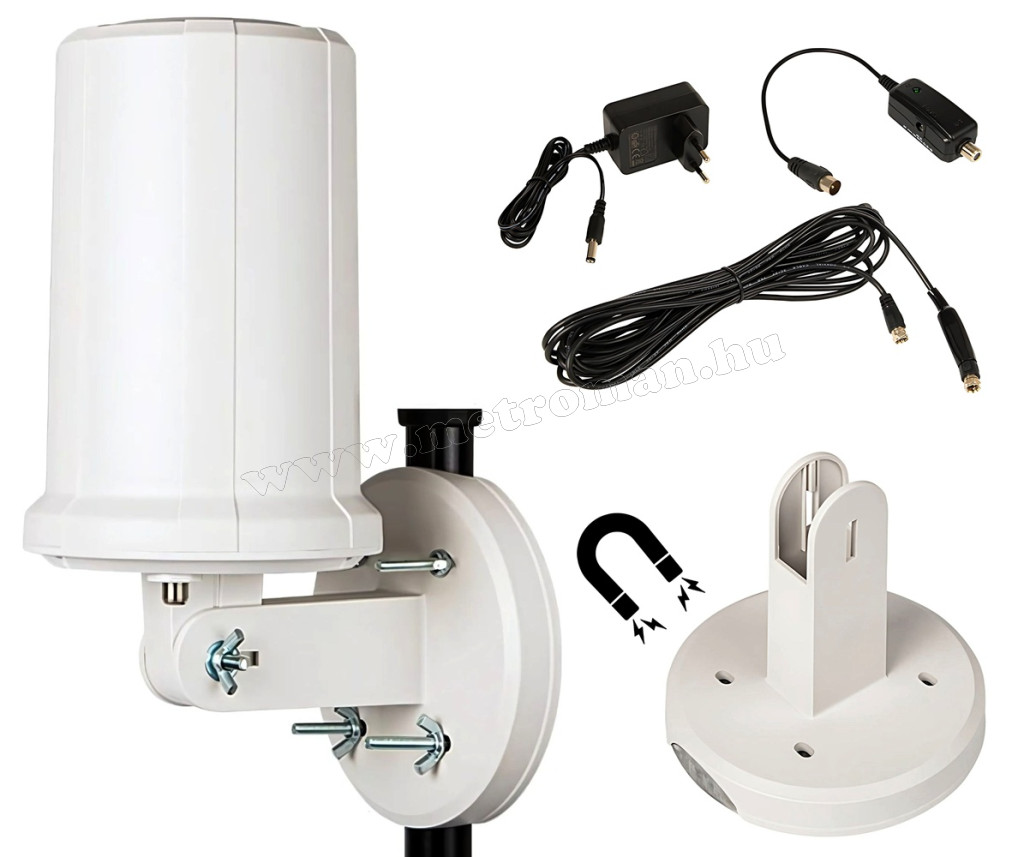 Könnyedén és gyorsan telepíthető DVB-T antenna, mely 360 fokos irányban képes a jelek fogadására. Használható mind szobai és kültéri TV antennának.  Beépített erősítője hatékonyan javítja a vétel minőségét gyengébb térerőjű helyeken is.