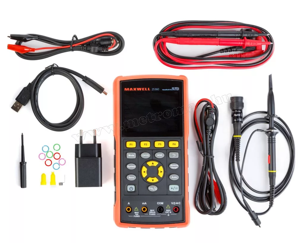 • Tartozék mérőszonda, mérőcsúcsok, krokodilcsipeszek, adatkábel, hálózati töltőfej, hordtáska