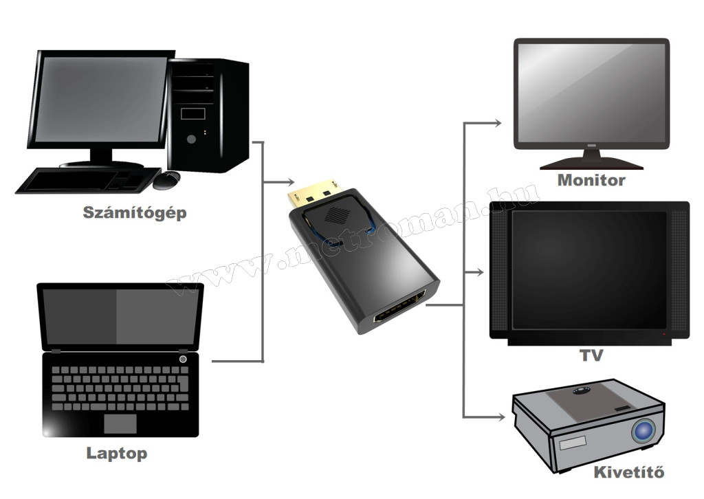DisplayPort - HDMI átalakító adapter, segítségével Thunderbolt (DP) csatlakozóval rendelkező számítógéphez, laptophoz csatlakoztathat szabványos HDMI-porttal rendelkező TV-t vagy projektort. Full HD 1080p minőségű, teljes HDMI jel átvitelét teszi lehetővé, így tiszta, egyenletes képet biztosít a csatlakoztatott monitoron.