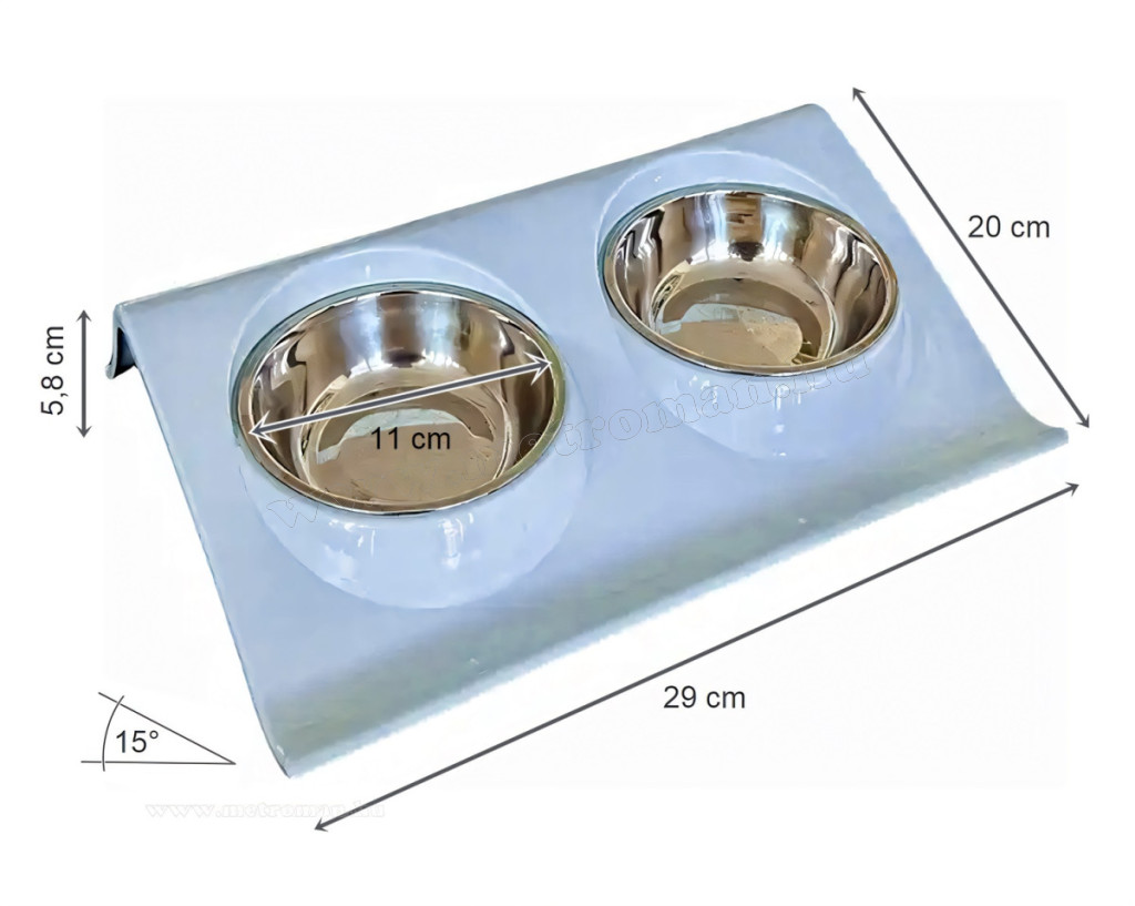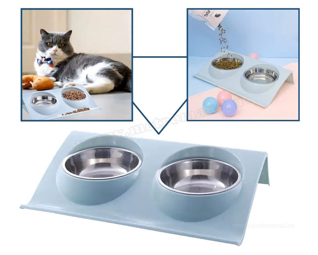 Dupla etetőtál és vizes tál kutyáknak, macskáknak. A két masszív rozsdamentes acéltál speciális, ferde állványon van elhelyezve. Ez a kialakítás megkönnyíti az evést, ivást a kisállatok számára, megakadályozza a táp vagy víz kiömlését és könnyen tisztántartható.