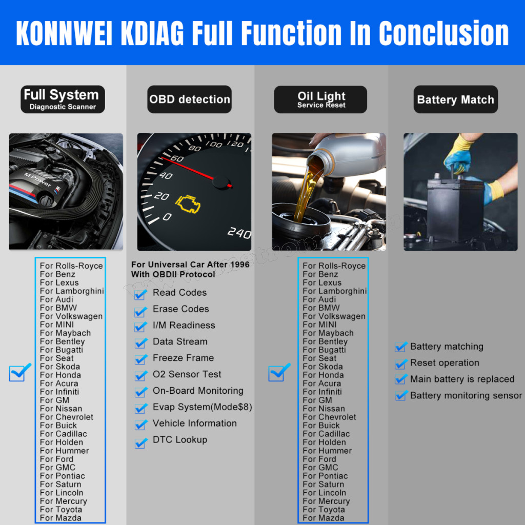 A KONNWEI KDIAG teljes rendszer OBD2 diagnosztikai eszköze minden rendszerdiagnosztikát támogat, beleértve a motor jelzőfényét, az ABS-t, a sebességváltót, a SAS-t, az ESP-t, a TPMS-t és egyéb rendszereket. Több speciális funkcióval felszerelt , mint például olajcsere visszaállítás, TPS csere visszaállítás, EPB (elektromos rögzítőfék) kód törlése, akkumulátor-állítás, DPF, SAS, befecskendező kódolás, felfüggesztés és lámpabeállítás több mint 39 márkájú autóhoz: