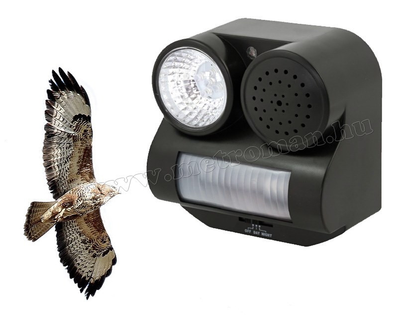 Beépített mozgásérzékelős, erős hangot kibocsátó galamb, seregély és madárriasztó. A mozgásérzékelő kb. 10 méterig érzékeli a mozgást.