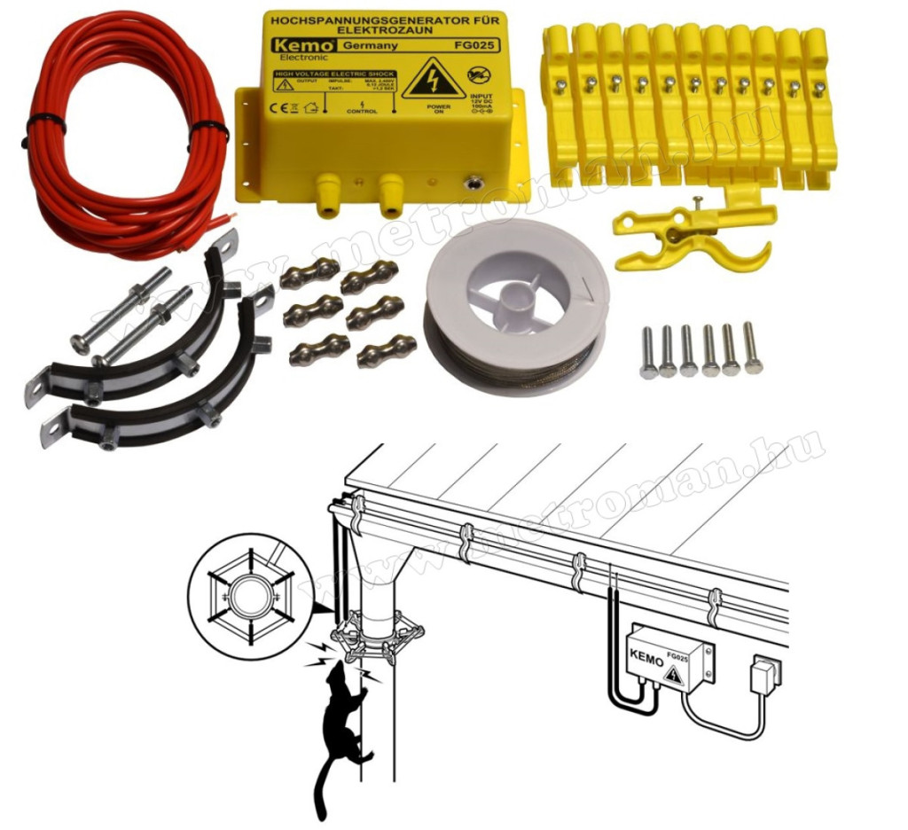 Nagyfeszültségű elektromos kerítés nyestek és kisebb testű állatok ellen, az ereszcsatornára és esőelvezető csőre szerelhető. Az állatok gyakran másznak fel az esőelvezető csövön és az ereszcsatornán, hogy így jussanak el a padlásra. A 2 pólusú elektromos kerítés elektromos áramütésével ezek az állatok hatásosan távol tarthatók. A készülék használható elektromos kerítésként, vagy arra is, hogy az állatokat távol tartsuk a veszélyes helyektől.