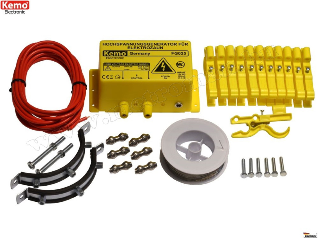 A Kemo FG025 villanypásztor alkalmas kisebb testű állatok, mint pl. kutyák, macskák, nyestek, rókák elriasztására. A készülék 1,2 másodpercenként bocsát ki egy 2400 Voltos rövid impulzust. A villanypásztort 12 Voltos akkumulátorról vagy tápegységről is üzemeltethetjük ( nem tartozék ! )