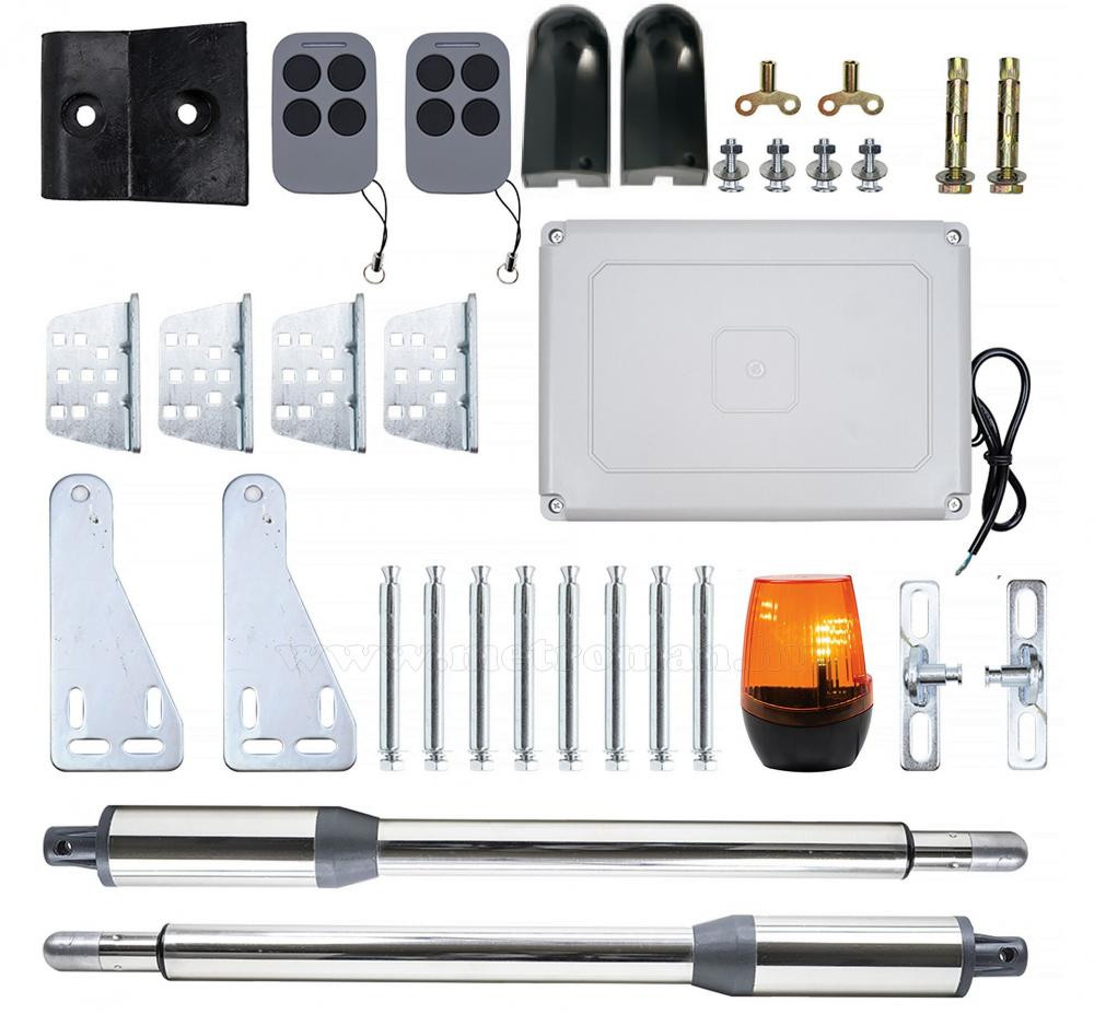 Komplett, elektromos kapunyitó, kétszárnyú távirányítós kapunyitó szett, mely minden szükséges kiegészítőt tartalmaz. A két 40 wattos motor max. 200 kg és 2,5 méter széles kapukat képes nyitni és zárni.