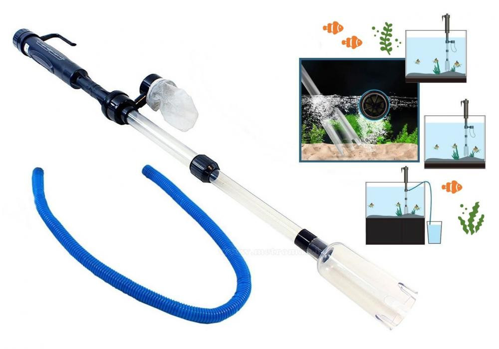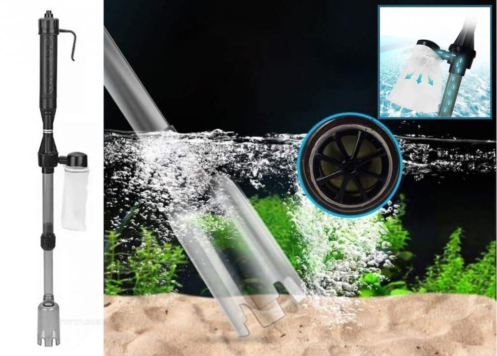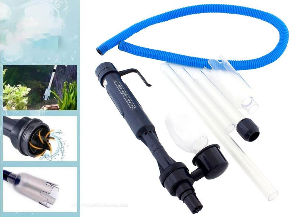 Ennek az elemes akvárium szivattyúnak a segítségével könnyedén megtisztíthatja a tartály aljzatát a szennyeződésektől a víz leeresztése nélkül. Az iszaptalanító a porszívóhoz hasonló módon szívja fel az akvárium aljáról a szennyeződéseket, melyet egy gyűjtőzsákba helyez, a tisztavizet pedig visszaereszti a tartályba. A vízmélységnek megfelelően hosszúsága két méretben állítható.