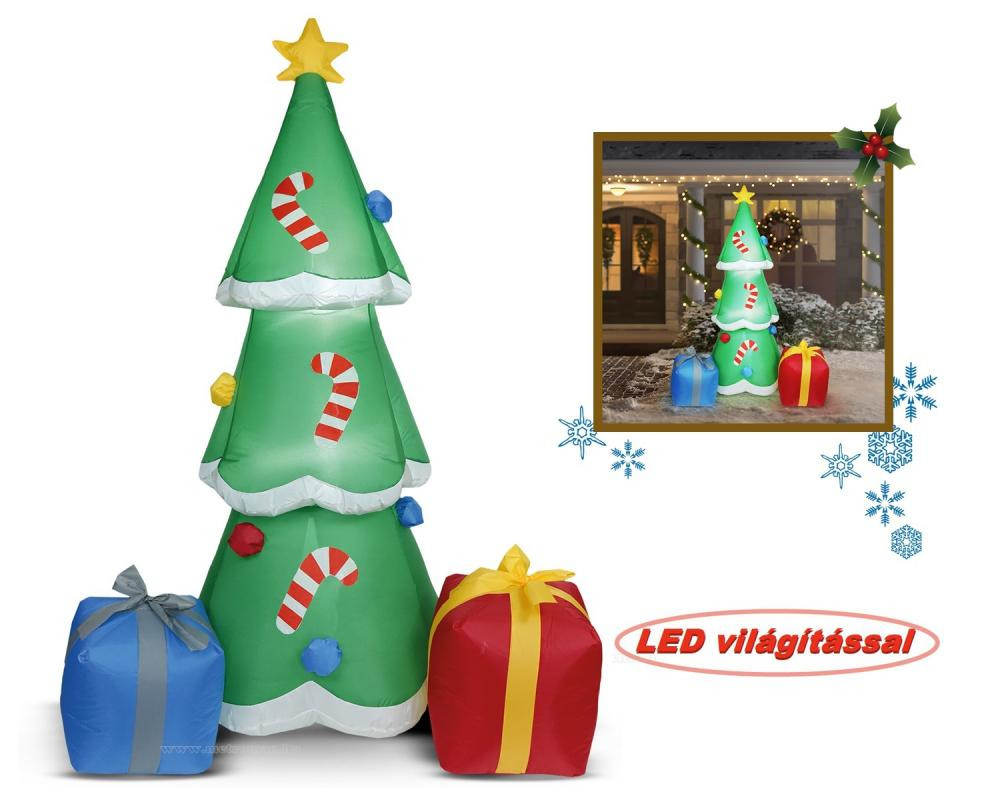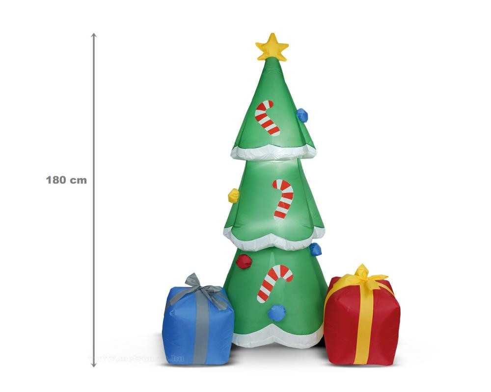 Felfújható karácsonyfa ajándékdobozokkal vidám, ünnepi dekorációja lehet kerteknek, udvaroknak, karácsonyi vásároknak. A nagyteljesítményű ventilátor gyors felfújást tesz lehetővé, a nagy fényerővel rendelkező LED, pedig kellőképpen megvilágítja a felfújt 180 cm magas fenyőt.