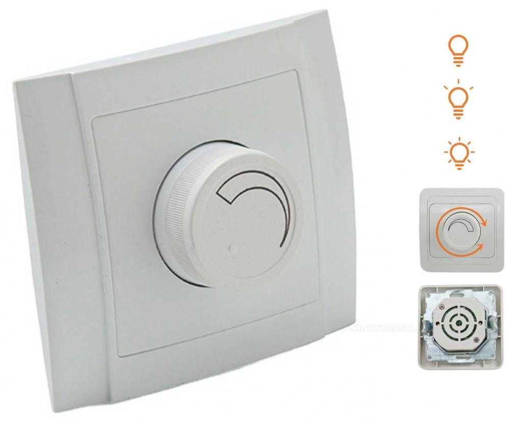 Forgatható dimmer fényerőszabályzó kapcsoló, melynek segítségével a lámpák fénye egyenletesen állítható.  A fényerő egyéni igények szerinti beállításával csökkentheti energiaköltségeit. Alkalmazható hagyományos izzólámpás, 230 V-os halogén, 12 V-os alacsony feszültségű halogén világításhoz. Teljesítmény: max. 600 W