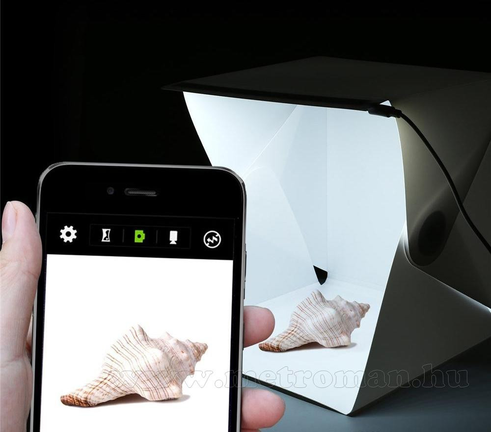 Kisméretű, összecsukható, ezáltal könnyen hordozható praktikus Fotódoboz beépített LED megvilágítással. Kitűnően használható kisebb tárgyak fotózására.  A Beépített LED világítás USB töltőről vagy powerbankról is használható.