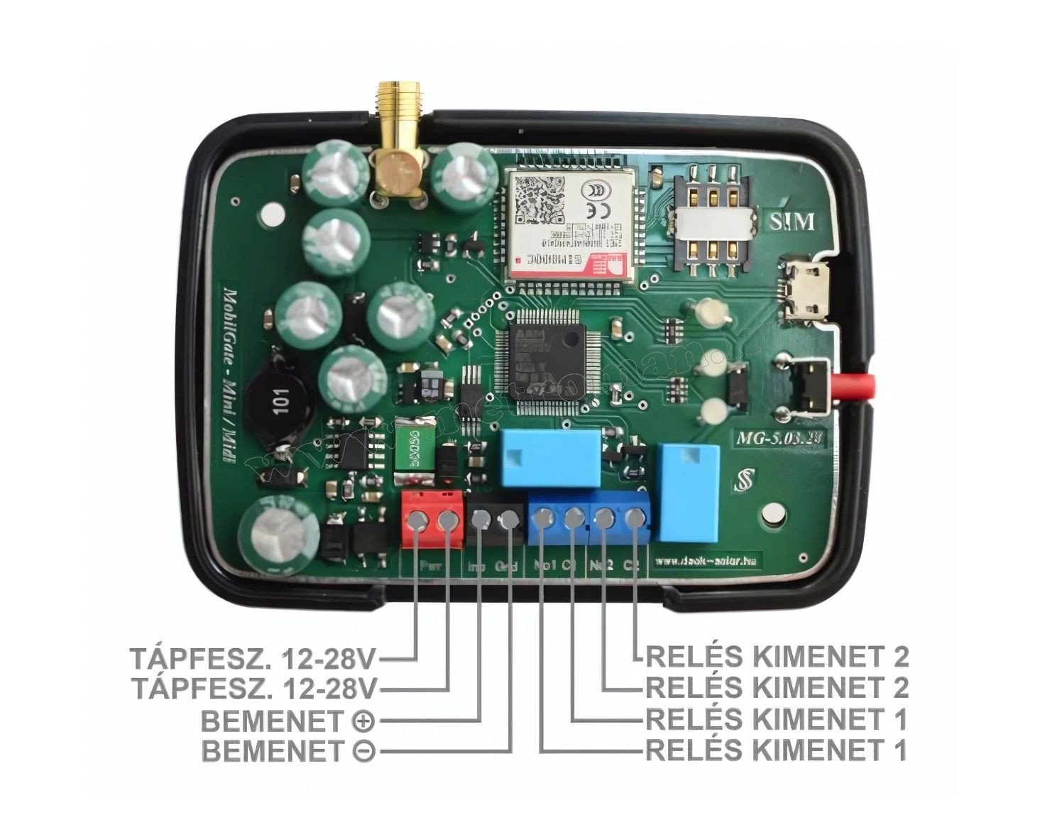 A MobilGate-Midi és a MobilGate-Max készülékek hardvere azonos, bekötésük is azonos, csak a működtető szoftverükben térnek el egymástól. A modul piros színű sorkapcsain 10-35Vdc egyen-, vagy 10-24Vac váltófeszültséget, és tetszőleges polaritással minimum 500mA-es terhelhetőségű tápfeszültséget igényel. A kontaktusos (pl. hibajel, jelző bemenet) 0V feszültség hatására, azaz a bemenet földre (nullára) kötésével kapcsolható. Ha az SMS bemenete open kollektorosan vezérelt, akkor tilos 5V-nál magasabb feszültségre felhúzni! Mindkét relés kimenete egy-egy kis-áramú egyáramkörös No típusú, és terhelhetőségük maximum 48V és 1A. A MobilGate-Midi zavarvédett, de feszültség a bemenetére nem kapcsolható. Bemenetét kapcsolhatja kontaktus, kapcsoló, jelfogó, relé, reed-relé kis átmeneti ellenállással, pergésmentesen.