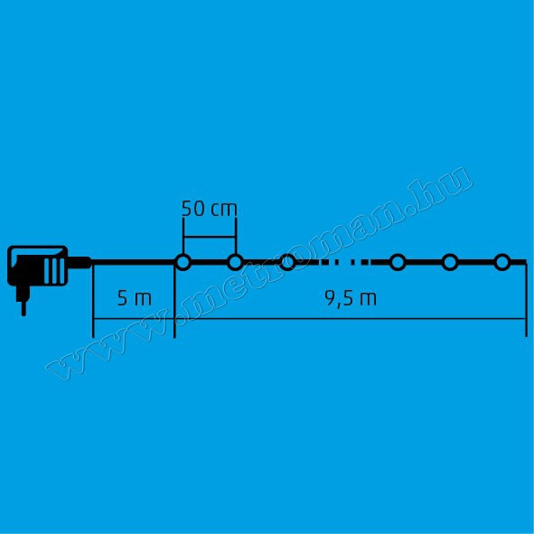 A körtéket diszkrét átlátszó vezeték köti össze. Tápellátását az IP44-es kültéri kivitelben kapható hálózati adapter biztosítja. Hosszúsága: 9,5 méter.