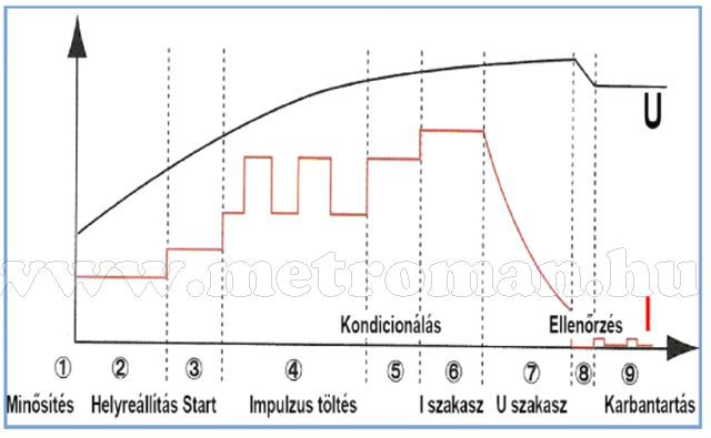 - 9 fázisú töltés , 12 Volt / 8 Amper