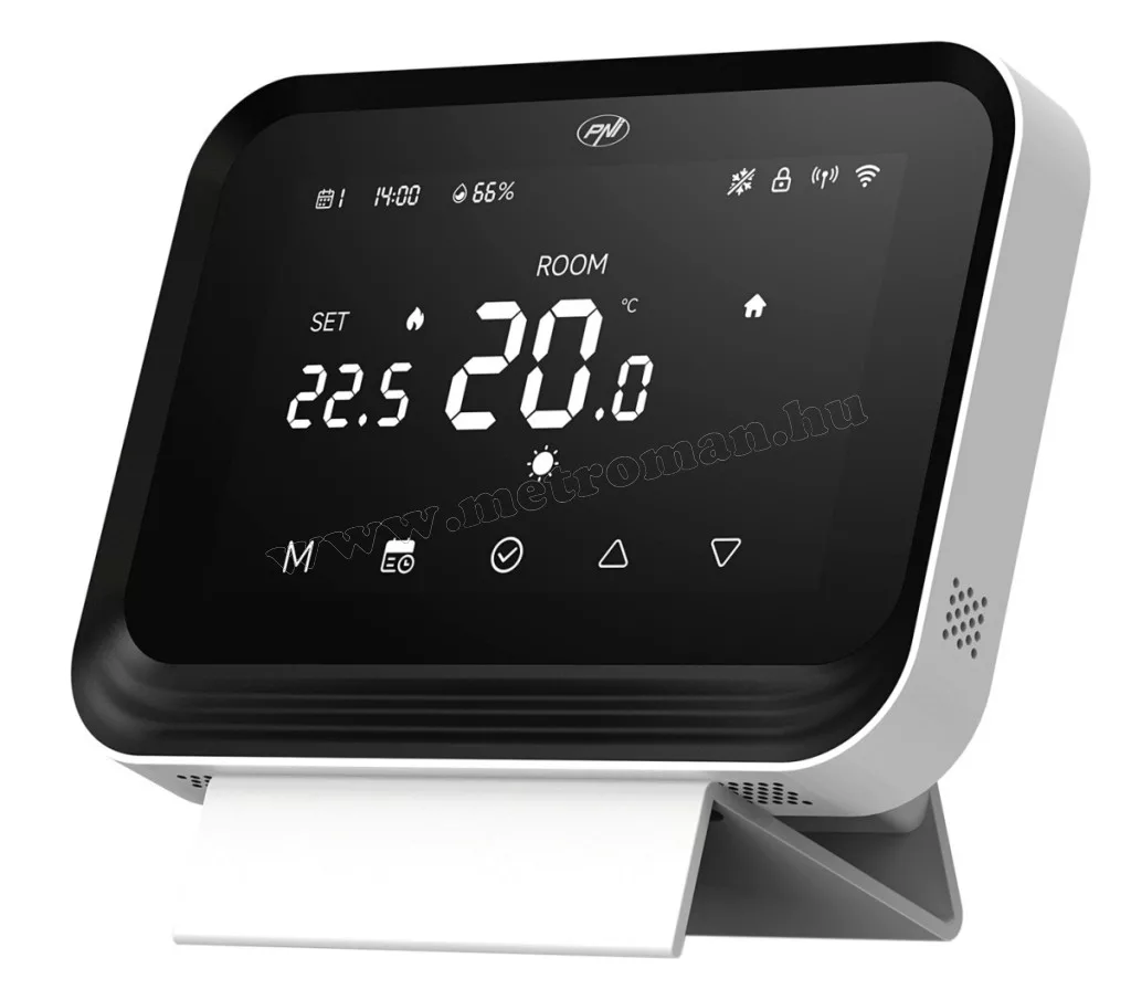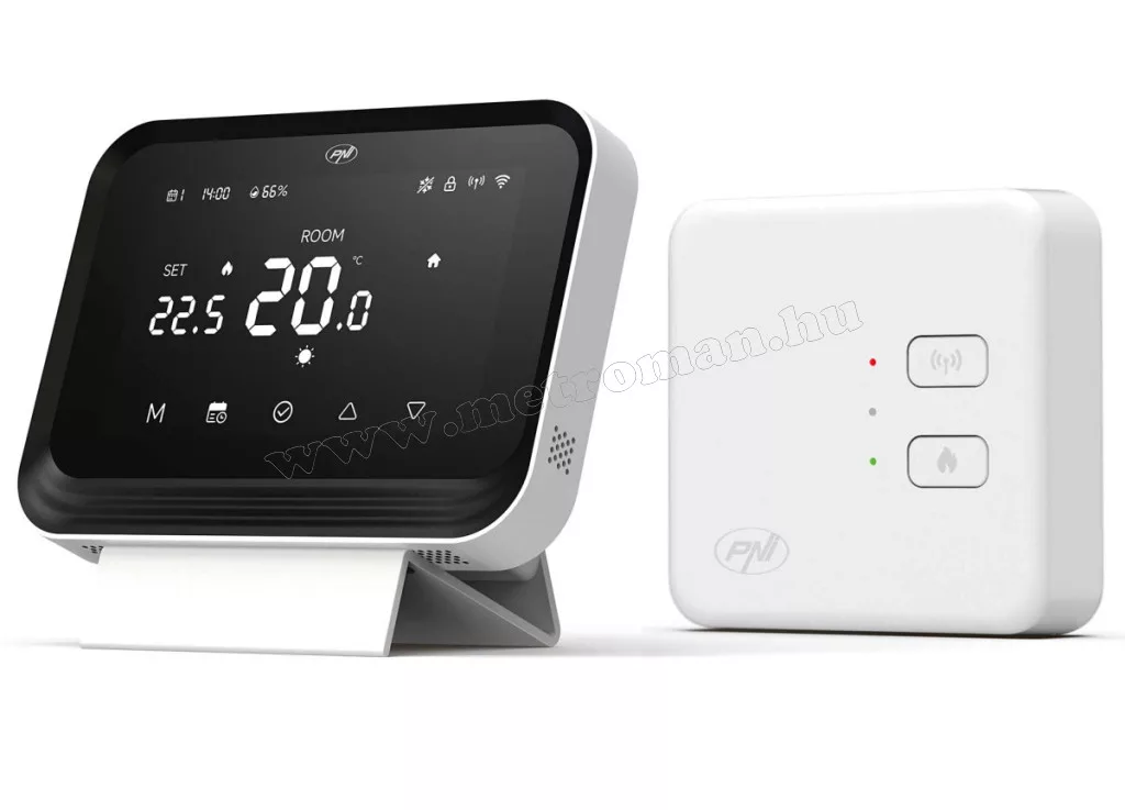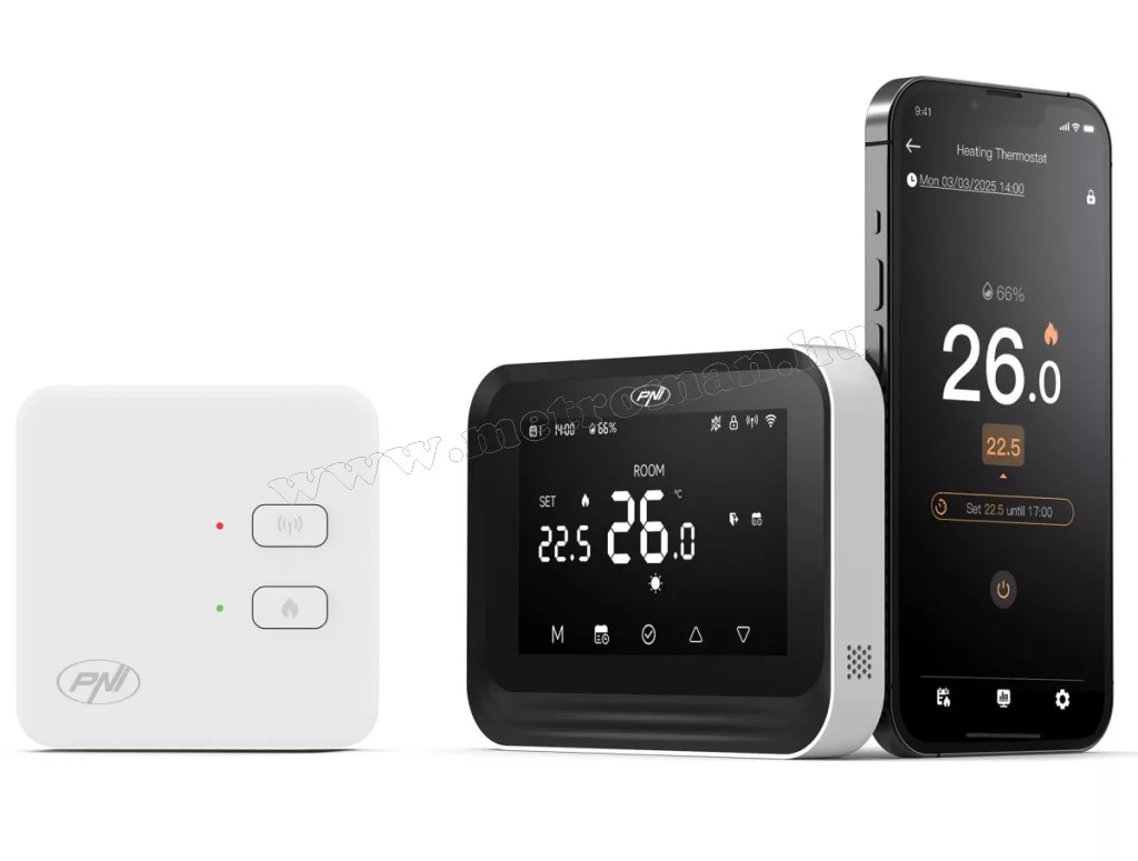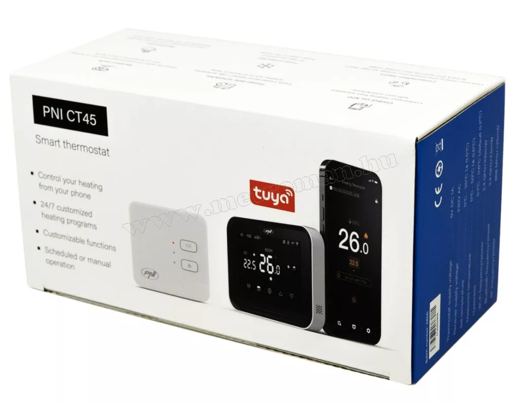 A PNI CT45 vezeték nélküli intelligens termosztát WiFi-vel távolról is vezérelhető okostelefonnal a Tuya Smart alkalmazáson keresztül. Bárhol is tartózkodik, interneten keresztül be- és kikapcsolhatja a fűtés rendszert, beállíthat különböző üzemmódokat és működési programokat, valamint módosíthatja a  különböző beállítási paramétereket.