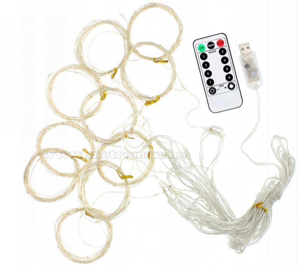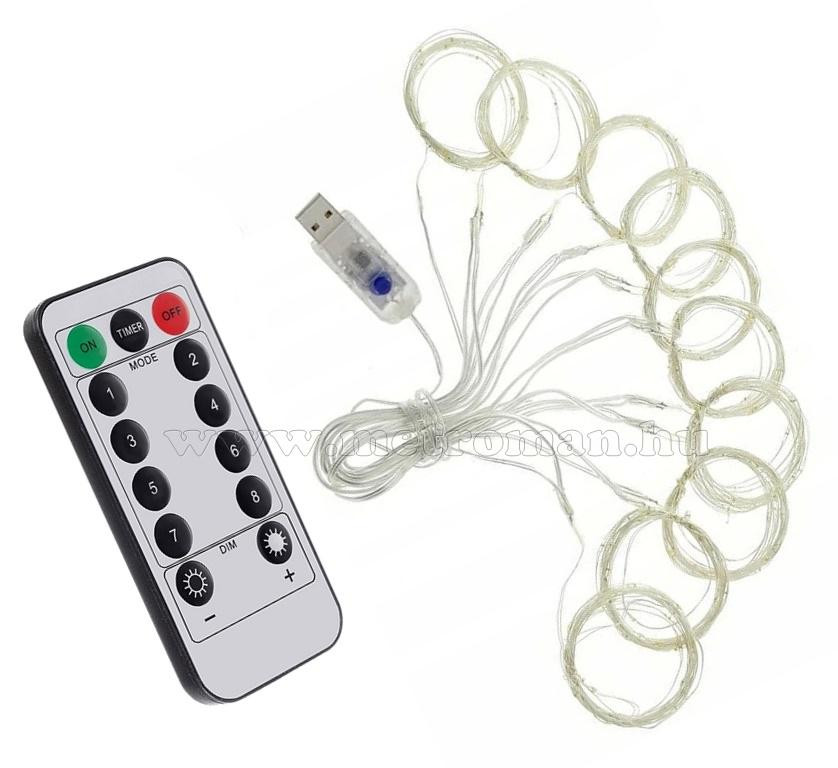 Dekoratív, 3x3 méteres micro LED-es fényfüggöny, mely USB csatlakozójának köszönthetően működtethető 230V vagy 12V USB töltőről és akár power bank külső akkumulátorról is. A tartozék távirányítóval fényereje szabályozható, Ki/Be kapcsolható és beállítható a kikapcsolási időzítés.
