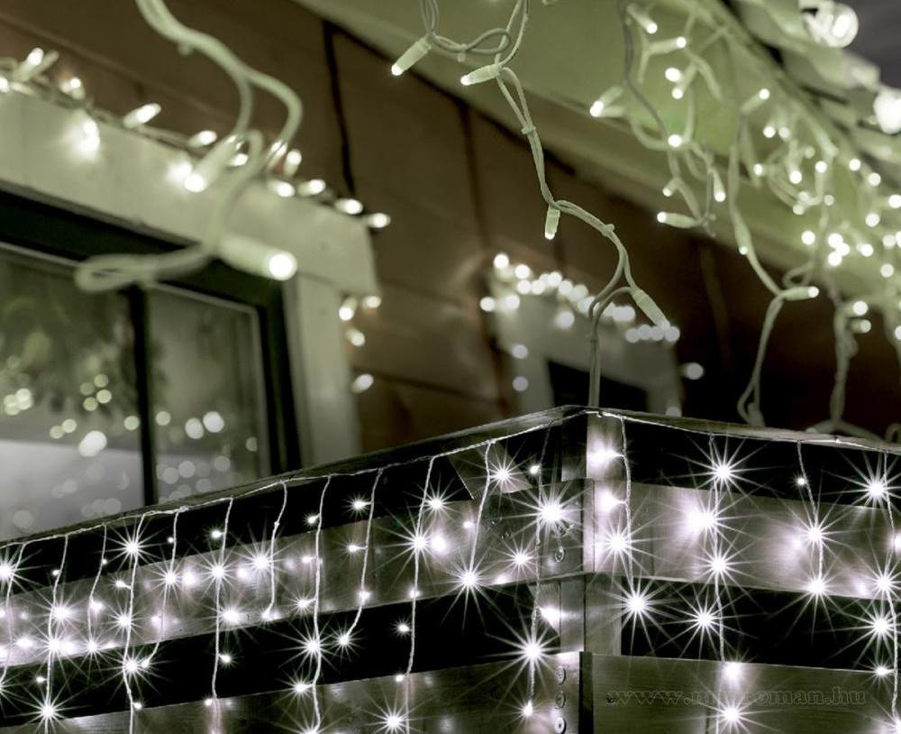 Kültéren és beltéren egyaránt használható dekoratív LED jégcsap fényfüzér 300 db  hideg fehér LED-el és biztonságos 31V IP44-es tápegységgel 10.8 Méteres füzérhosszal.