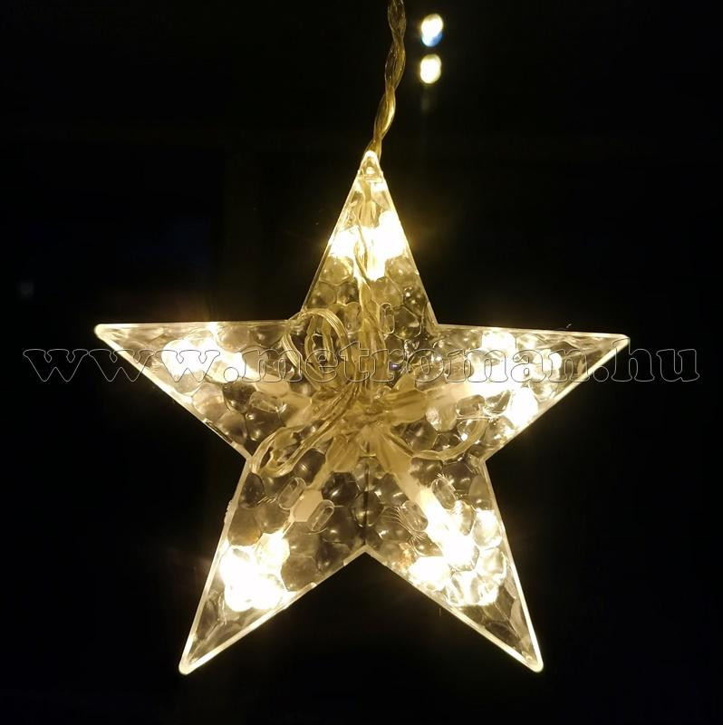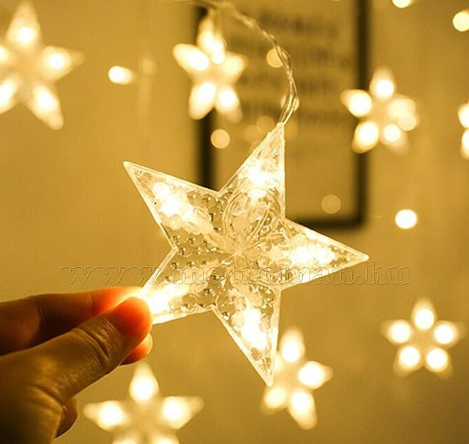 Dekoratív, 12 db csillaggal szerelt LED fényfüzér. A csillagokat összekötő fény függöny rész 3-5 db meleg fehér LED-et tartalmaz.