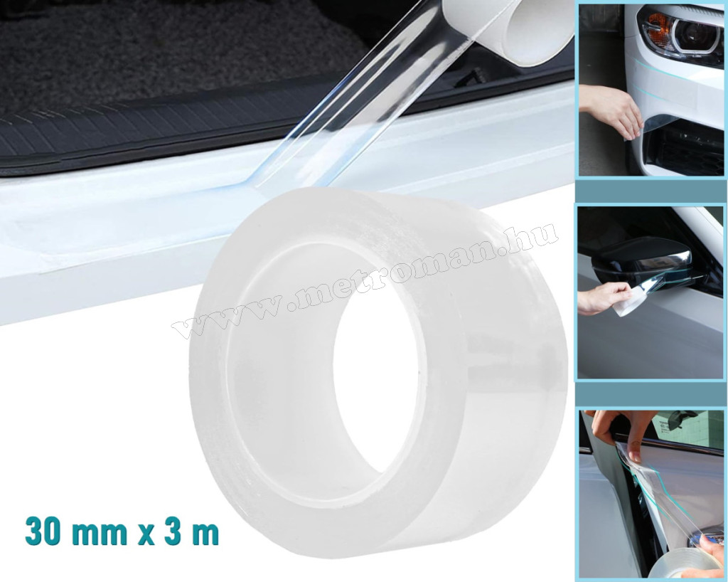 Univerzális karosszériavédő fólia az autó karosszéria elemeinek külső és belső védelmére. Megóvja a felületet karcolásoktól, ütődéstől, kőfelverődéstől. Teljesen átlátszó, így bármilyen színű autón alkalmazható, a legigénybevettebb területeken pl. küszöbök, lökhárító, ajtóélek, visszapillantótükör. Könnyen felhelyezhető, méretre vágható, öntapadós kivitel.