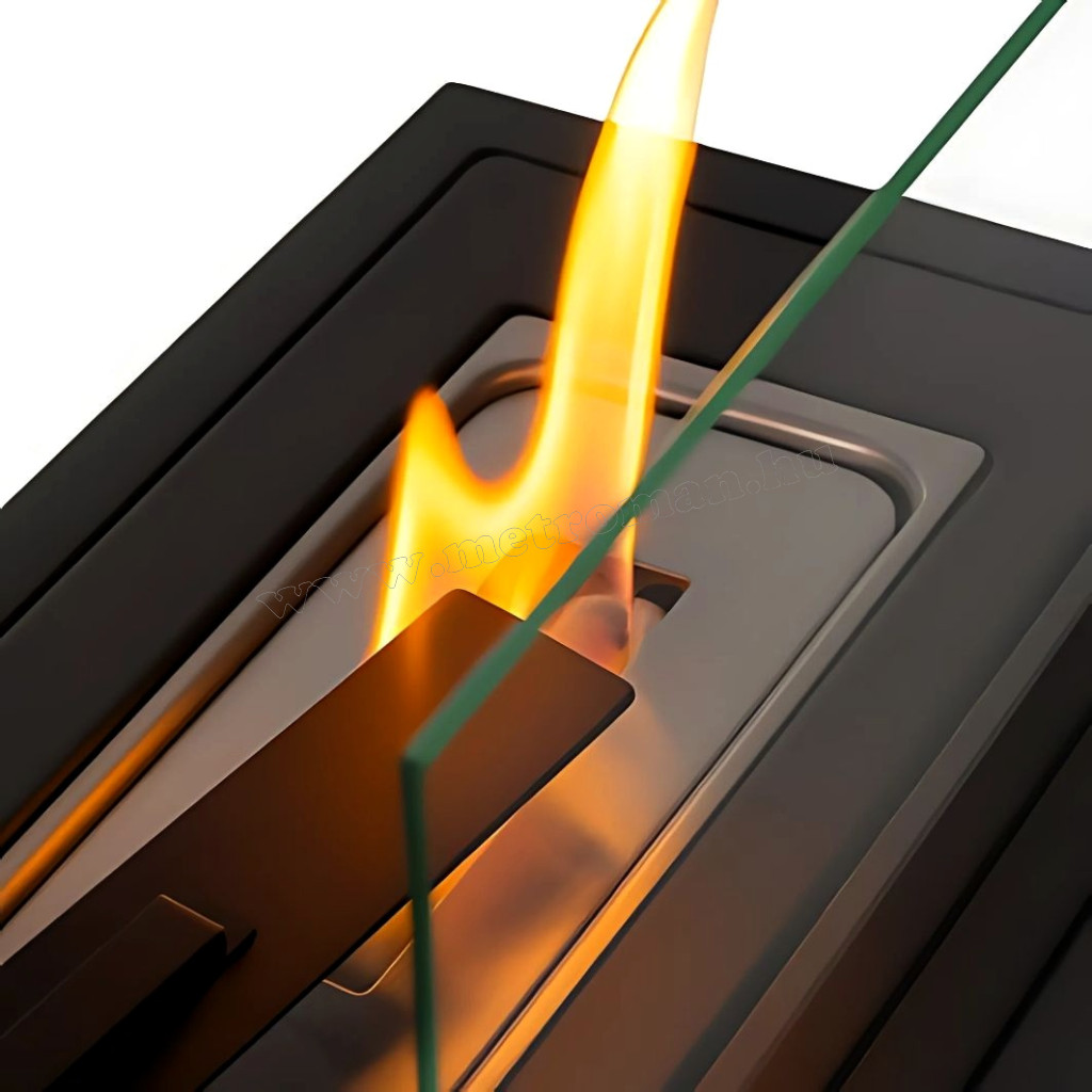 A két oldalüveg edzett, ami jobban ellenáll a hőterhelésnek és mechanikai igénybevételnek, mint a normál üveg. A stabil fém váz csökkenti a felborulás kockázatát, a zárt tartályos kialakítás pedig segít az egyenletes lángképen és a szabályozott felhasználáson