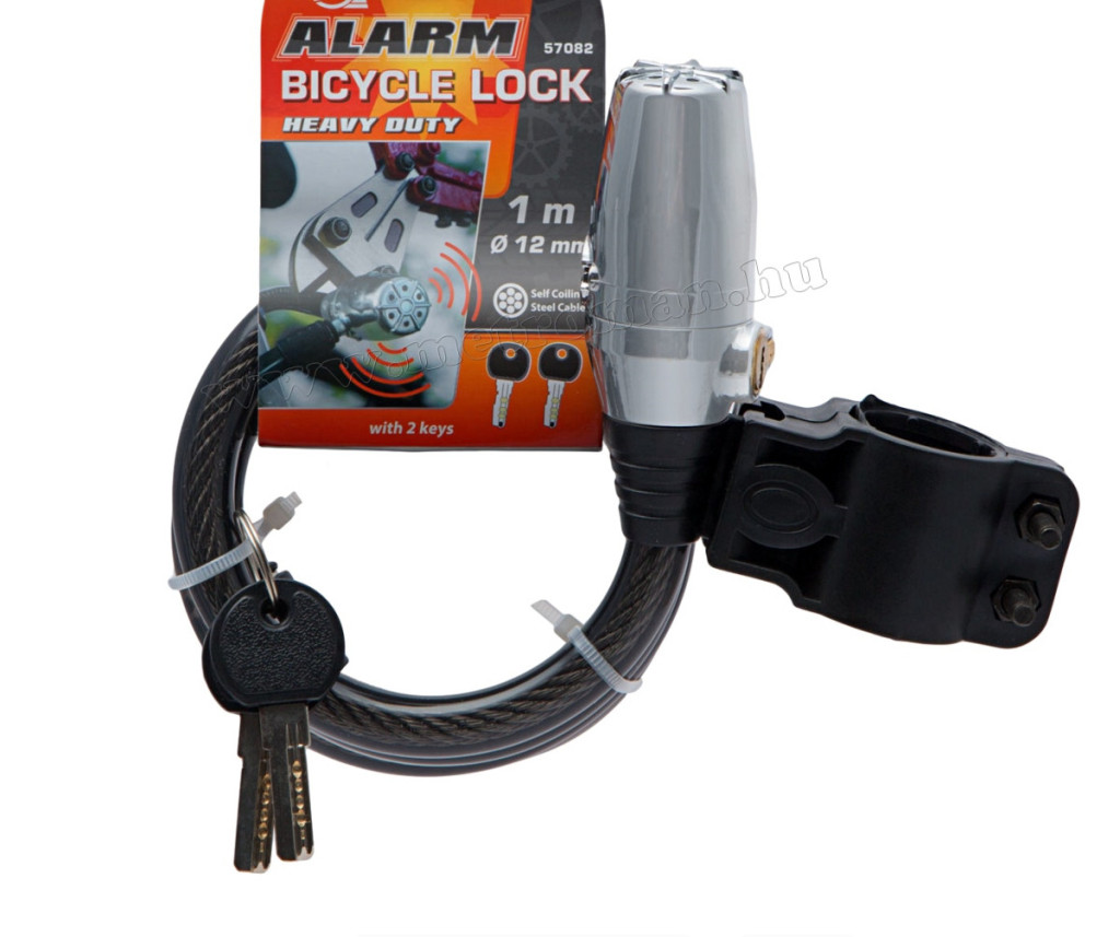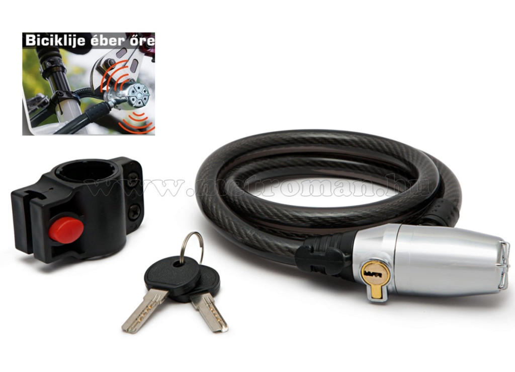 erékpár sodrony lakat (kábelzár). A bevont acélkábel ellenállóbb a vágó támadásokkal szemben. Minőségi zárszerkezet, 2 db kulccsal, riasztó funkcióval. A lakat zárásakor csipogó hang jelzi, a riasztó bekapcsolást. Az acélkábel mozgatásával, átvágásával, a sziréna megszólal, ezzel biztosítva nagyobb védelmet értéktárgyának.