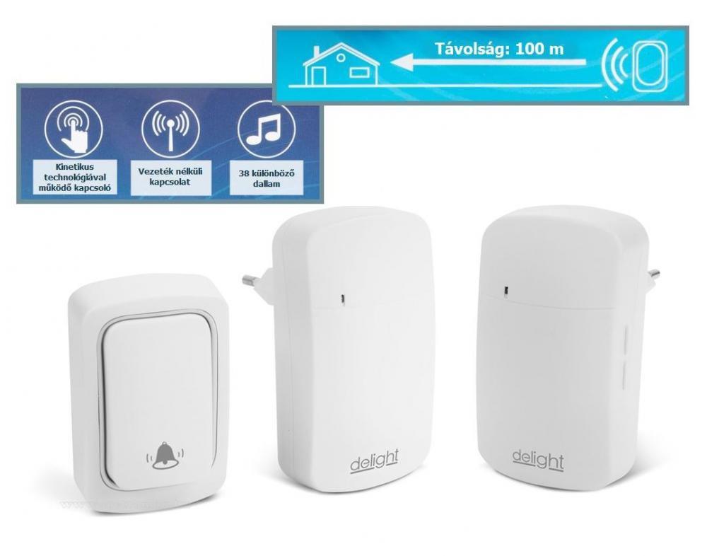 Elem nélküli, vezetéknélküli  csengő két vevőegységgel. A KINETIC technológiának köszönhetően nincs szükség elemre a kapcsoló működtetéséhez, a dinamó elvén működik.