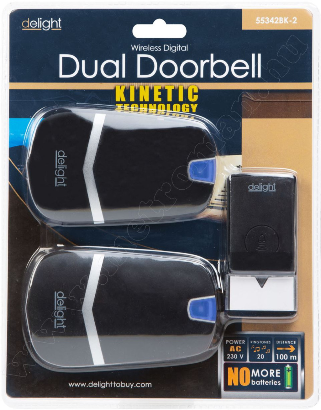 Nincs többé bosszúság a lemerült elemek miatt! A Delight 55342BK-2 Kinetic technológiás vezeték nélküli csengő elem nélkül is kitűnően használható! IP44 (fröccsenő víz ellen) védettség.