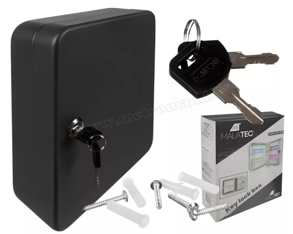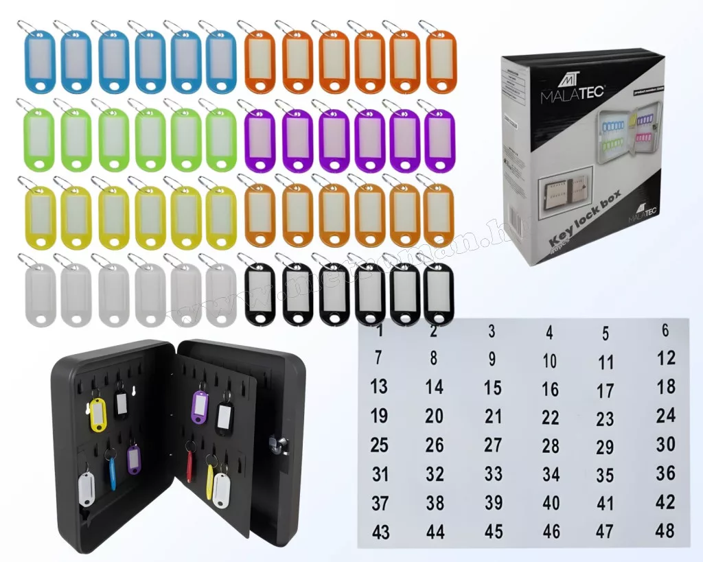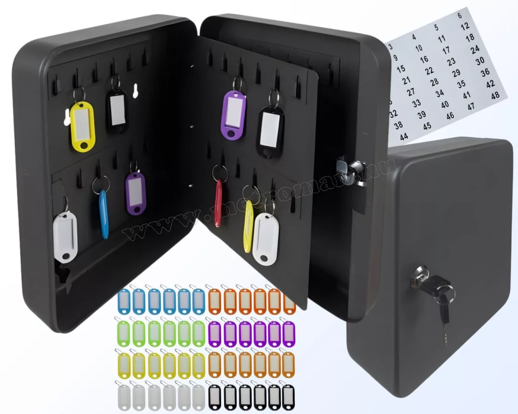 Ez a masszív, fémből készült, kulccsal zárható fali kulcstartó megakadályozza, hogy illetéktelenek férjenek hozzá a kulcsokhoz. A színek vagy számok szerinti rendszerezéshez számozott matricák valamint 48 db azonosítókártya áll rendelkezésre 8 különböző színben. A kulcskazetta alkalmazható irodák, szertárak, szervertermek, autókulcsok védelmére.