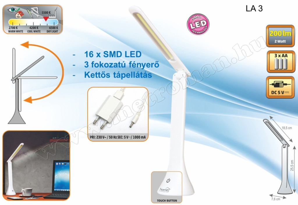 Az állítható fejű, érintőgombos asztali lámpa, 16 db hidegfehér SMD LED-del biztosítja a megfelelő világítást változtatható fényerővel, 3 fokozatban tartozék. A lámpatest beépített LED-lámpákat tartalmaz. A lámpák nem cserélhetők a lámpatestben.