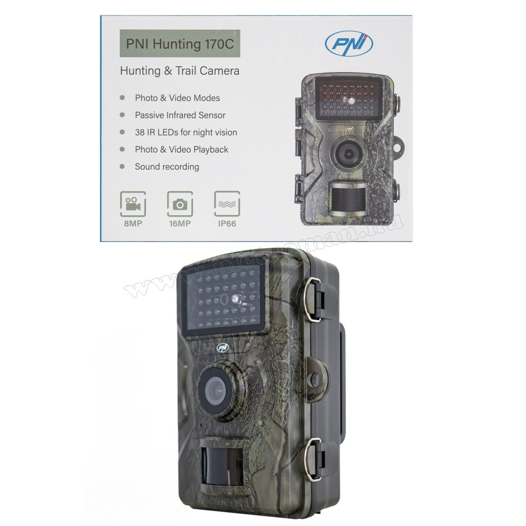 A PNI Hunting 170C vadkamera 16 MP-es fotókat és akár 4K videót készít, így ideális vadmegfigyelésre és kültéri megfigyelésre. A PIR mozgásérzékelő 15 m-ig érzékel, 0,3 mp-es reakcióidővel indítja a felvételt. Választható fotó / videó / fotó+videó mód, éjjellátás 38 IR LED-del, IP66 vízálló ház, 2" színes kijelző és microSD kártyahely garantálja a megbízható, önálló működést terepen is.